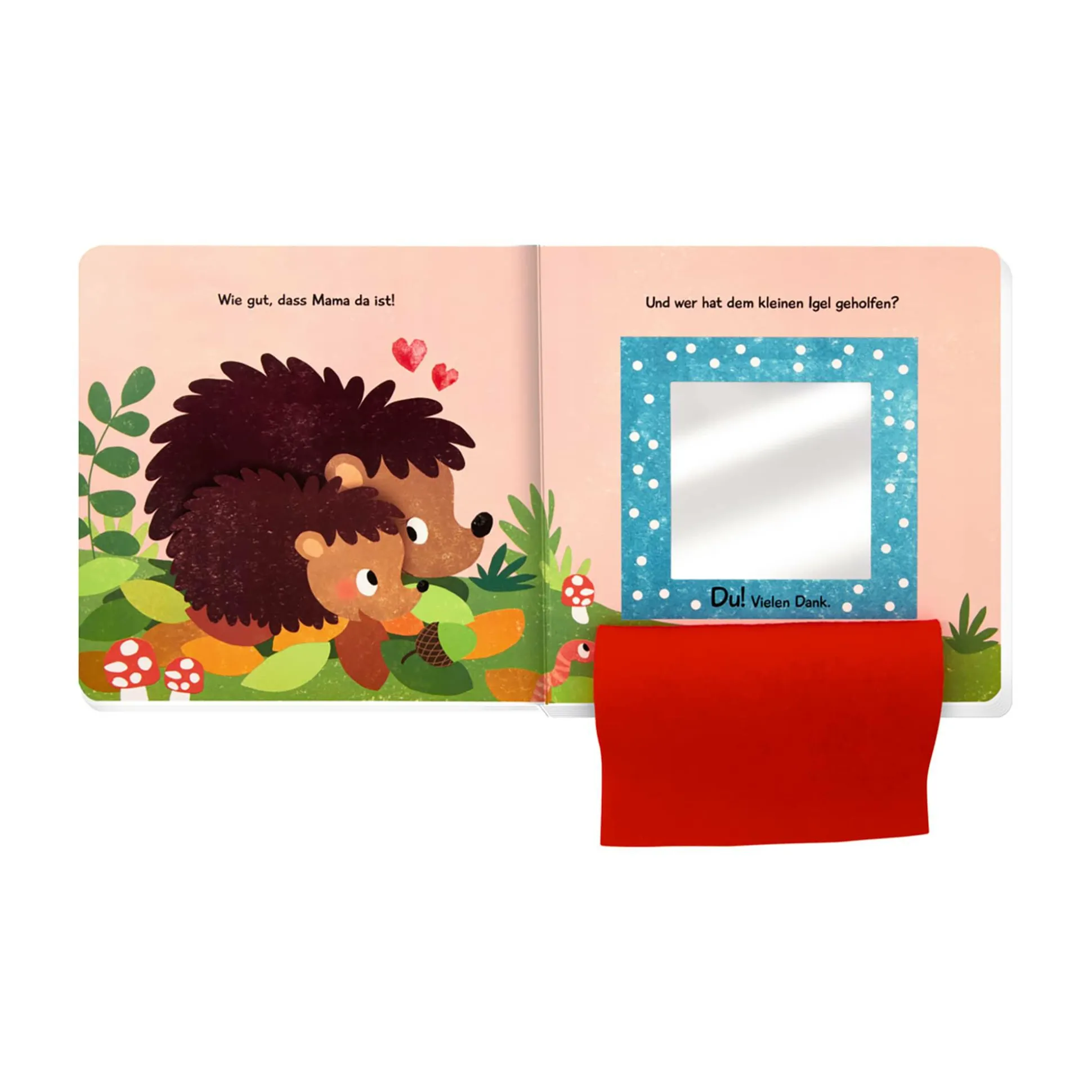 Mit kuschelweichen Klappen, einem Spiegel und einfachem Text zum Mitsprechen und Mitspielen. Beliebtes Kuckuck-wer-ist-da?-Prinzip.