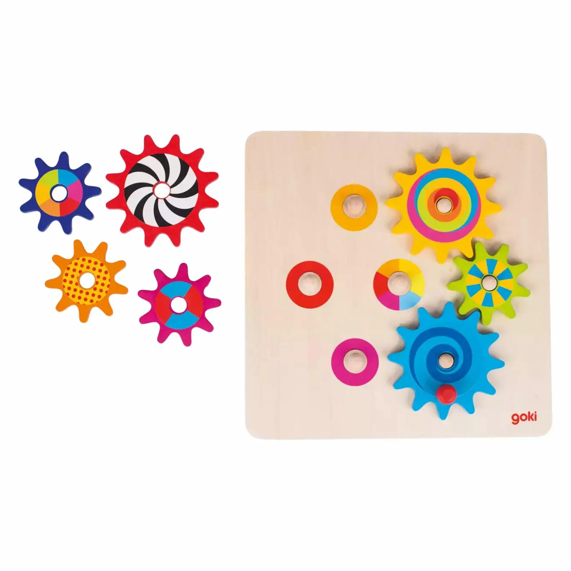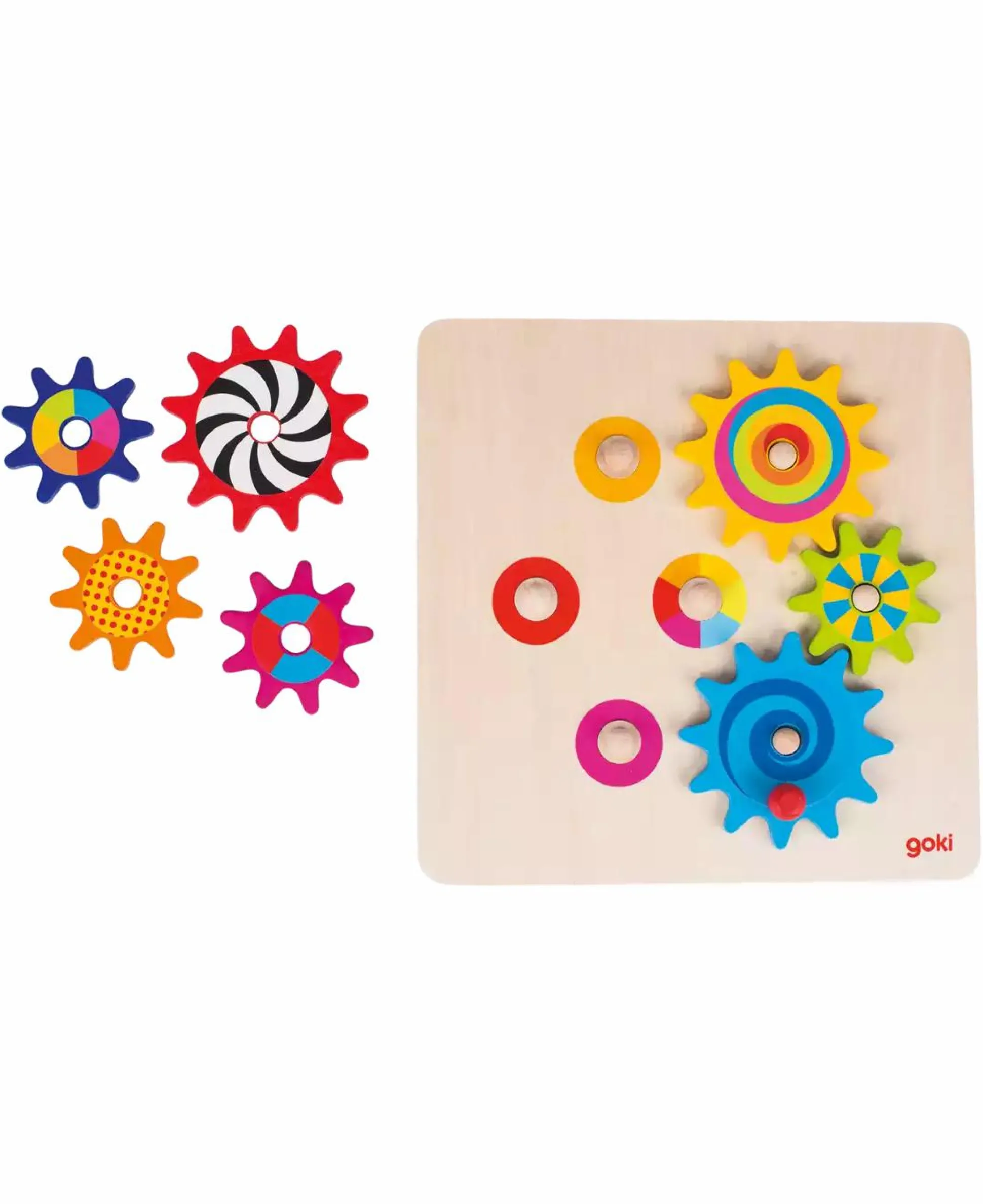 Es macht einen riesengroßen Spaß, die bunten Holzzahnräder auf dem Tableau zusammen zu stellen. Passt alles? Drehen sich alle Zahnräder, sobald das große blaue Zahnrad bewegt wird? Erst dann hat man mit Erfolg gespielt!