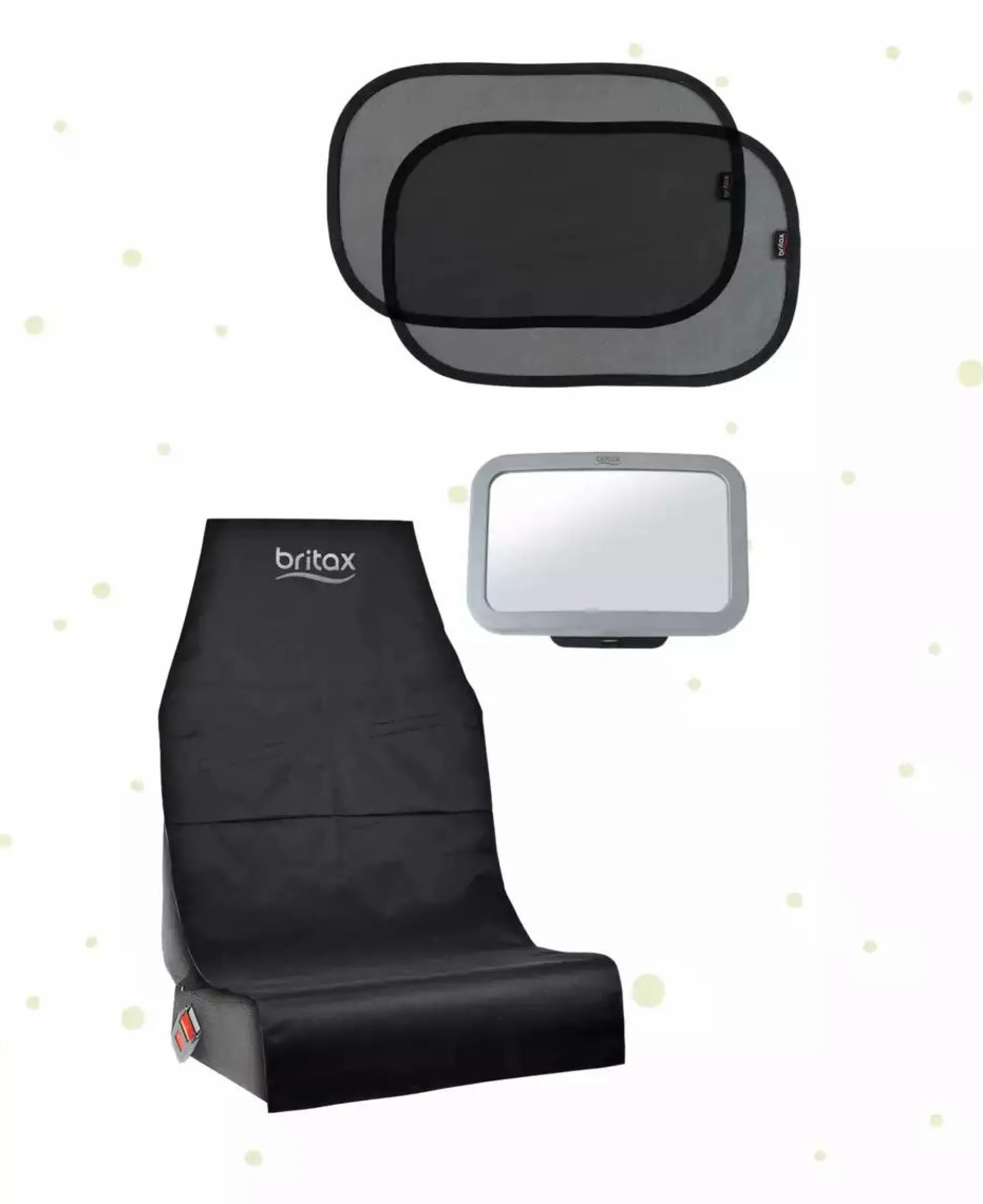 - Set bestehend aus Rücksitzspiegel, zwei selbsthaftenden Sonnenblenden und Kindersitzunterlage