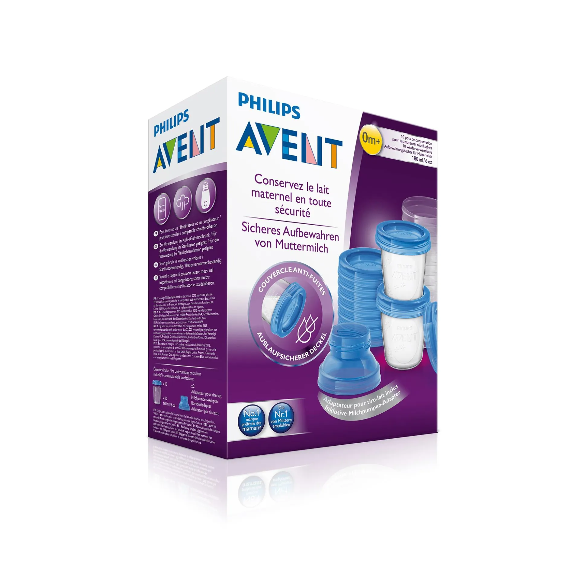 Wiederverwendbare Muttermilchbehälter inklusive auslaufsicherer Deckel von Philips Avent für sicheres Aufbewahren und Transportieren von Muttermilch. Sie sind stapelbar und geeignet zur Verwendung im Kühl- und Gefrierschrank. Außerdem sind die Becher kompatibel mit Philips Avent Milchpumpen, Klassik-, Klassik+- und Naturnah-Saugern. Die Muttermilchbehälter können ohne Bedenken im Flaschenwärmer, in der Mikrowelle, in der Spülmaschine und im Sterilisator verwendet werden.