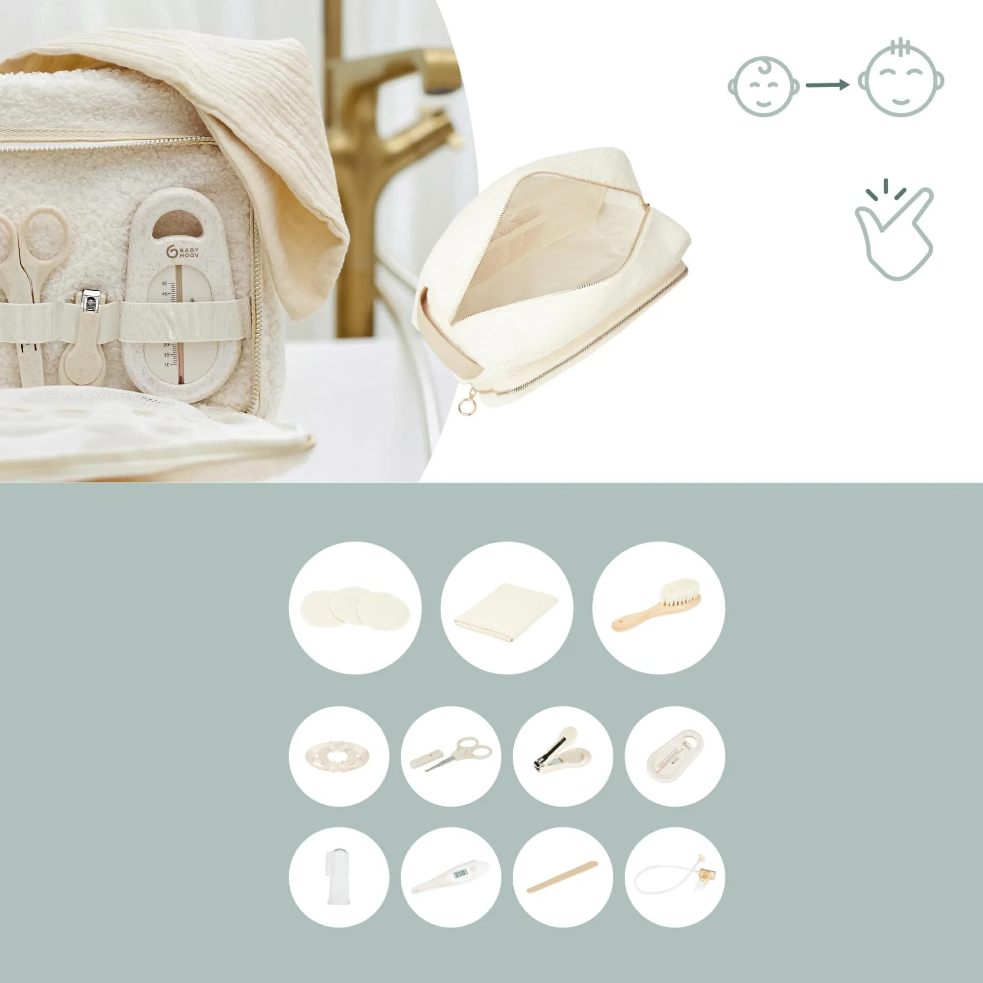 - 11 Accessoires inklusive: 1 Wickeltuch aus doppelter recycelter Baumwolle 60 x 60 cm, 3 wiederverwendbare Mikrofasertücher, FSC-zertifizierte Holzbürste, Badethermometer, Fieberthermometer, Beißring, Nagelfeile, Nasensauger, Nagelknipser, Spitzenschere und Zahnfleischmassagegerät