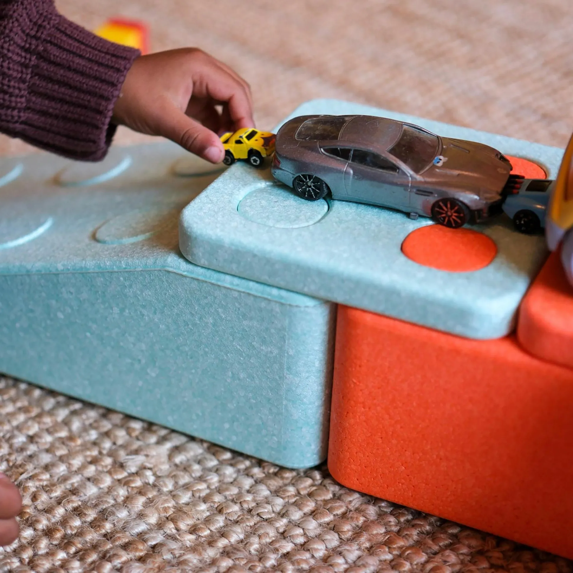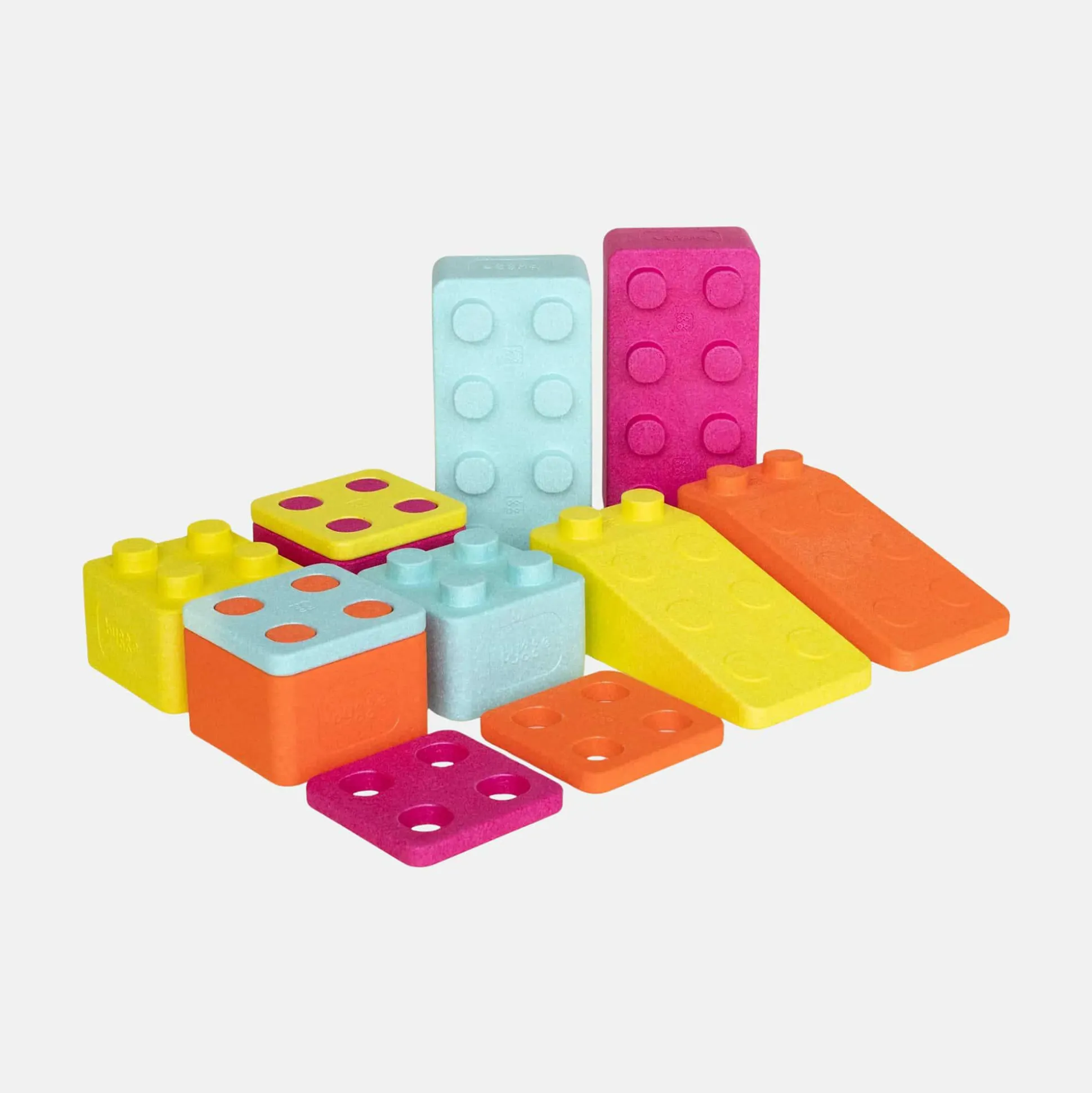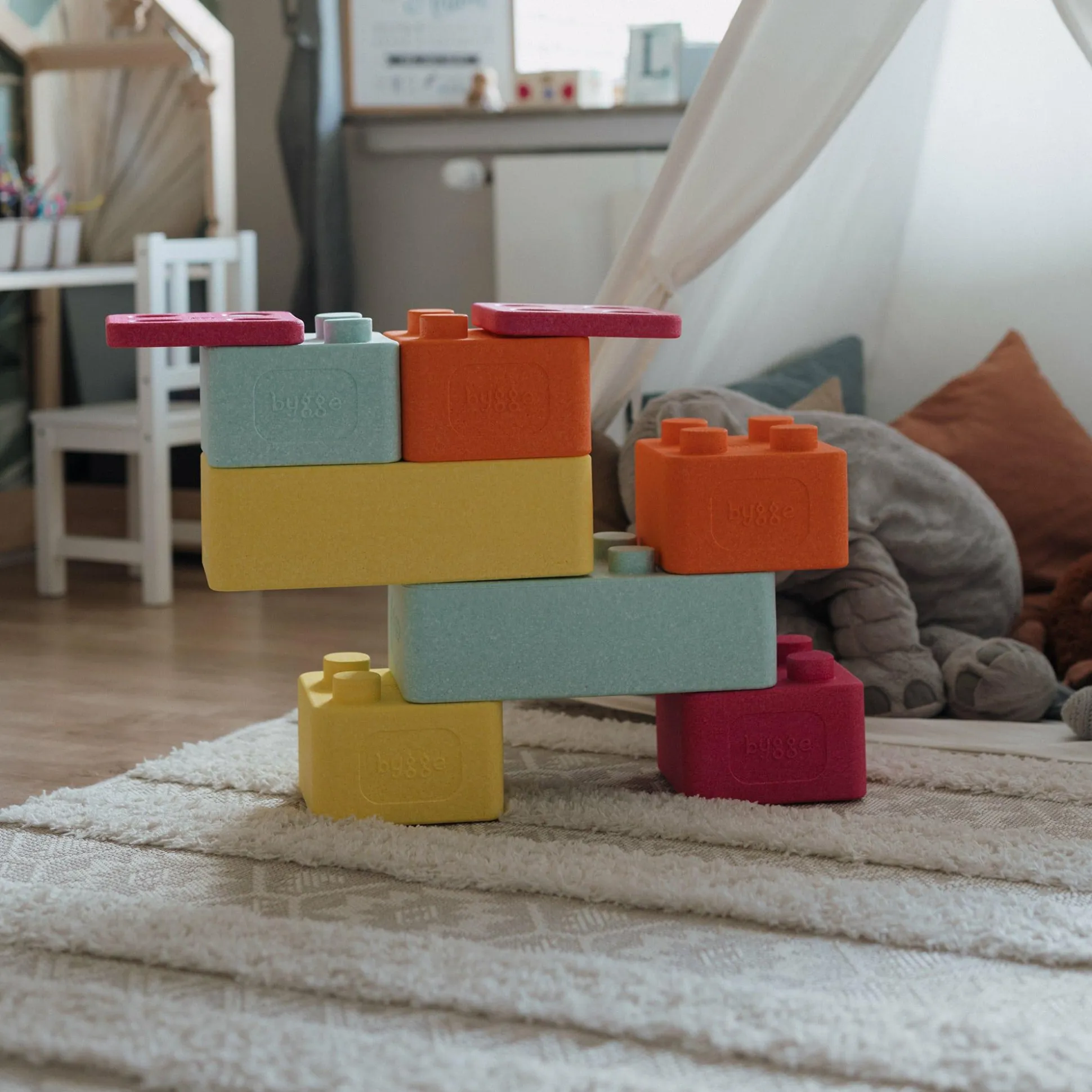 Die großen, bunten Bausteine bieten unzählige Spielmöglichkeiten, Konstruktionen und Parcours, sowohl drinnen im Kinderzimmer als auch draußen im Garten oder Sandkasten. Dabei fördern sie besonders die Motorik, Kreativität und Selbstvertrauen durch aktives, selbstständiges Spiel.