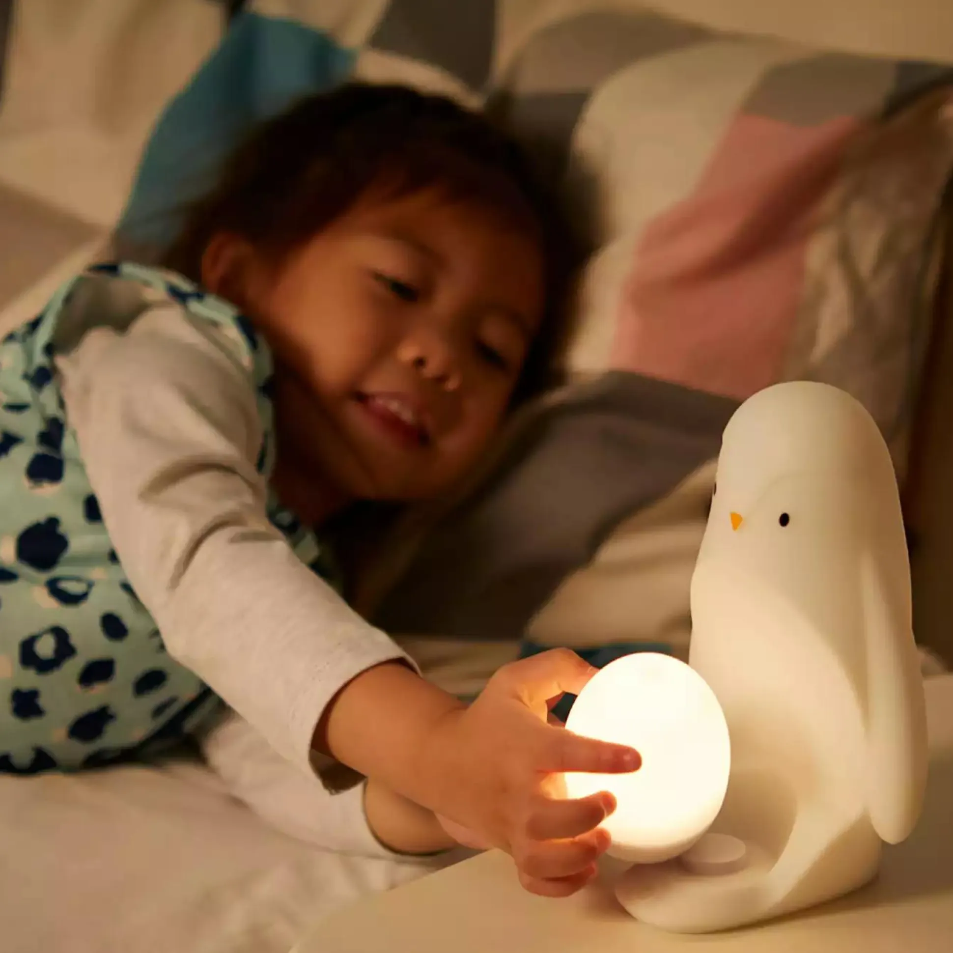 Ab 18 Monaten kann dein Kleines dann mit der tragbaren Leuchte den Weg ins Badezimmer erleuchten oder unter der Bettdecke lesen. Dieses kleine, taktile und beruhigende Pinguin-Nachtlicht ist der nächtliche Freund, der den Weg erhellt.