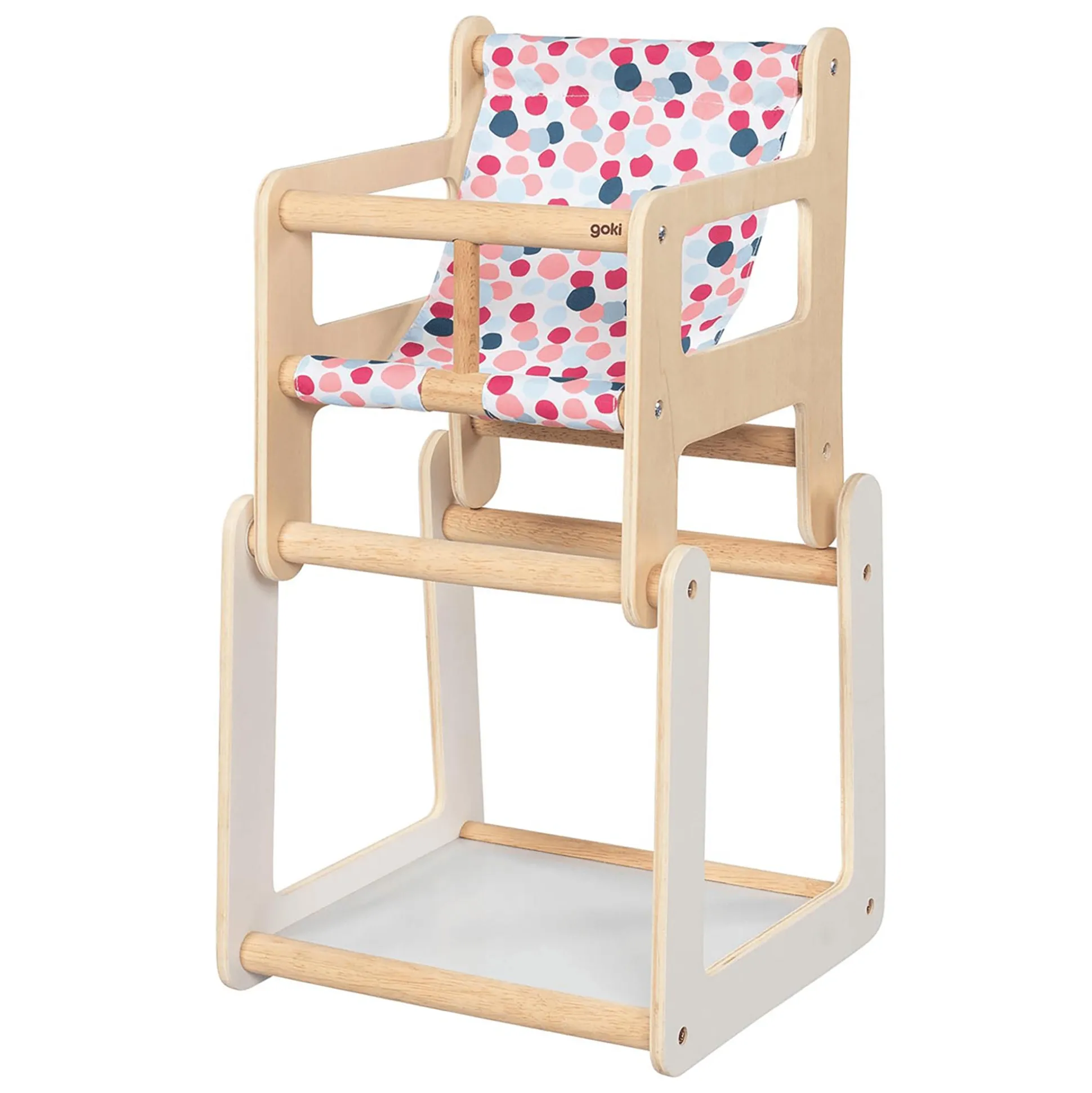 Dieser tolle Puppenhochstuhl von goki kann vielseitig eingesetzt werden, denn in nur wenigen Handgriffen wird aus ihm ein Sitzplatz mit Tisch! So hat dein puppenbegeisterter Schatz nicht nur ein, sondern gleich zwei Möbelstücke zum Spielen und Entdecken. Der bunt getüpfelte Stoff macht diese 2 in 1-Kombination außerdem zu einem echten Hingucker in jedem Kinderzimmer!