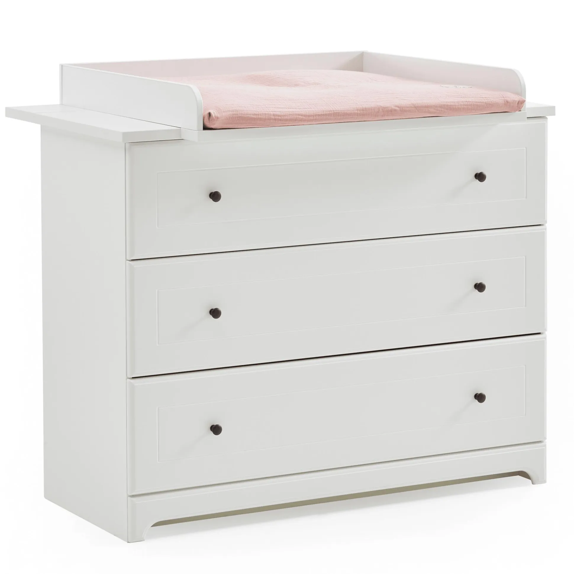Die wunderschöne Wickelkommode Gretha von Arthur Berndt bietet drei große Schubladen mit Mitteltrennungen für eine ideale Ordnung im Kinderzimmer. Ein abnehmbarer Wickelaufsatz ist inklusive. Dank dem Self-Soft-Close kannst du die Schubladen einfach leise und sicher schließen. Die Kommode besitzt eine Melamin-Oberfläche, die besonders pflegeleicht ist.