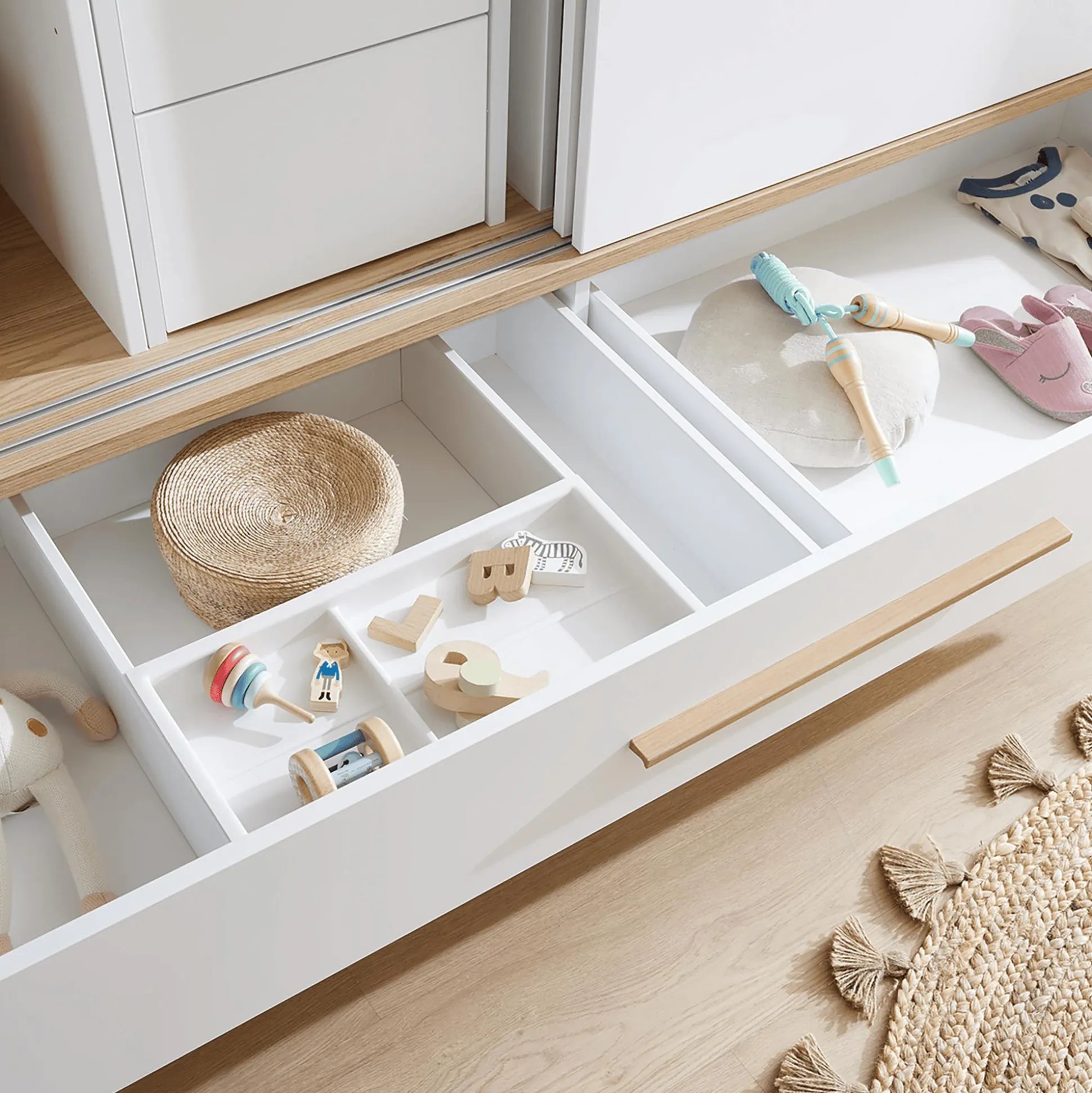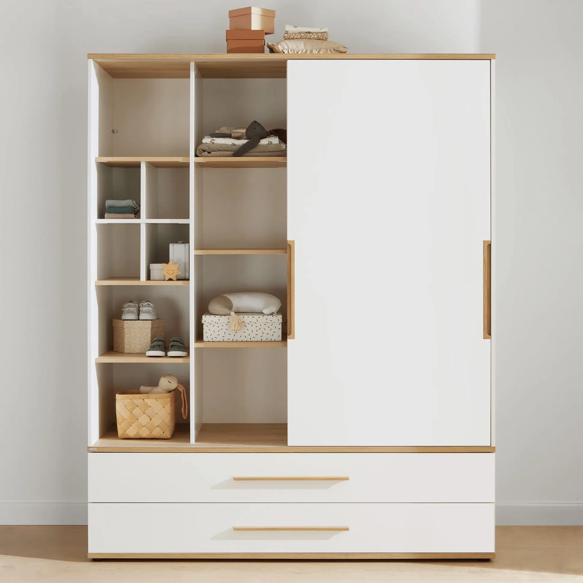 Der Kleiderschrank „Yolanda“ von Paidi ist die perfekte Lösung für das Kinderzimmer deines Lieblings. Mit seiner extra breiten Konstruktion und den beiden Schiebetüren bietet er reichlich Platz für die Kleidung deines Kindes. In den beiden zusätzlichen Schubladen können Socken, Bodys und weitere Accessoires perfekt organisiert werden. Das ansprechende Design in Kreideweiß mit Eiche-Montana-Dekor fügt sich harmonisch in jedes Raumkonzept ein und verleiht dem Zimmer eine moderne Note.