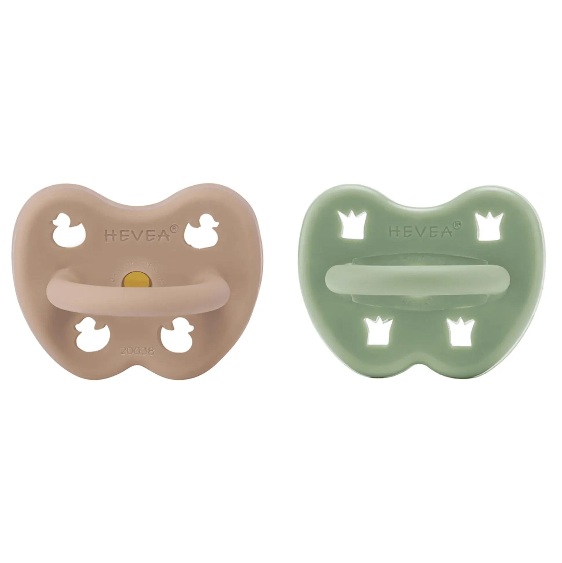 Diese süßen Schnuller sind schadstofffrei und biologisch abbaubar, denn sie sind rein pflanzlichen Ursprungs, aus Naturkautschuk und gefärbt mit natürlichen Farbpigmenten. Beide Schnuller haben eine Schmetterlingsform und die bei HEVEA einzigartigen Ventilationslöcher, hier in Form von süßen Enten und hübschen Kronen.