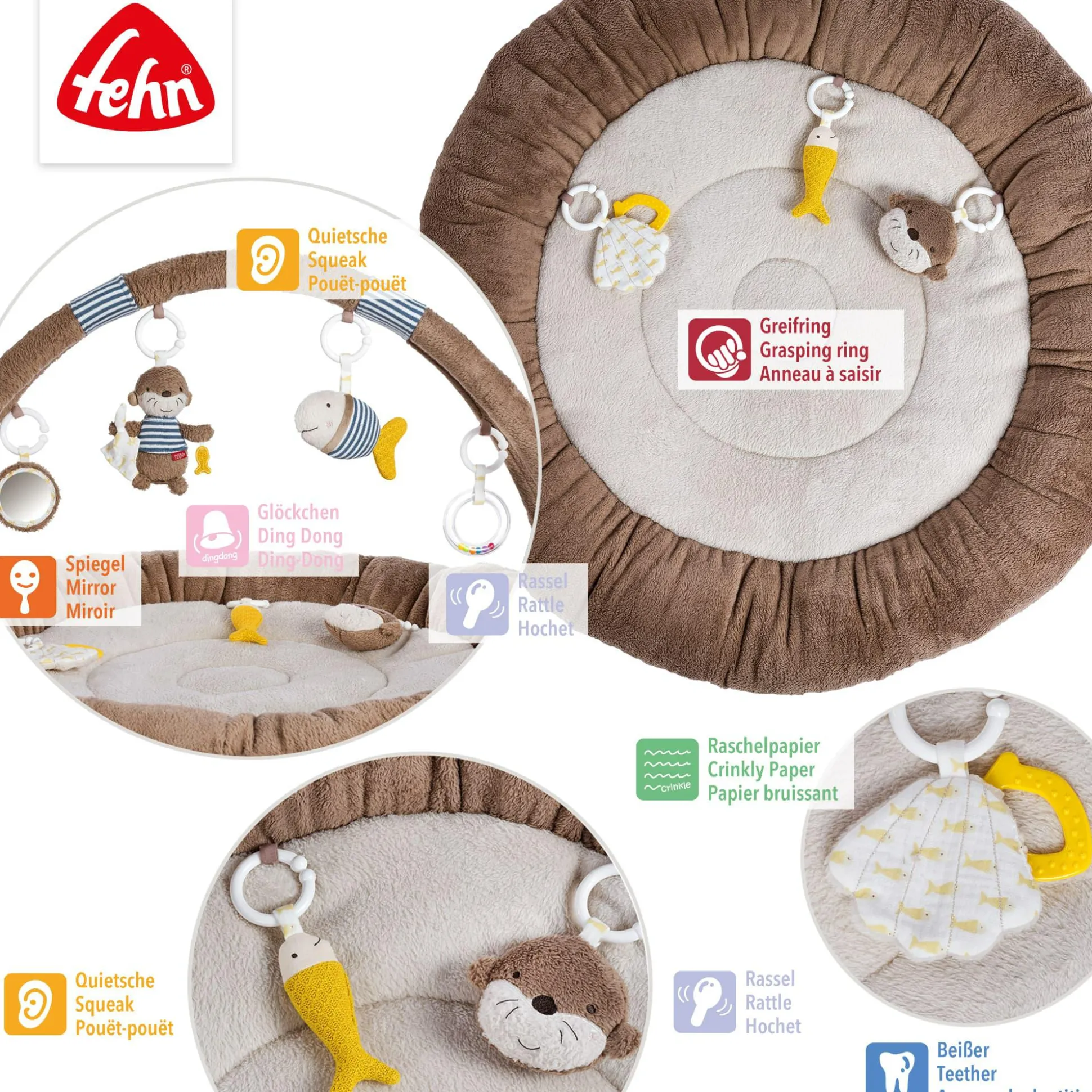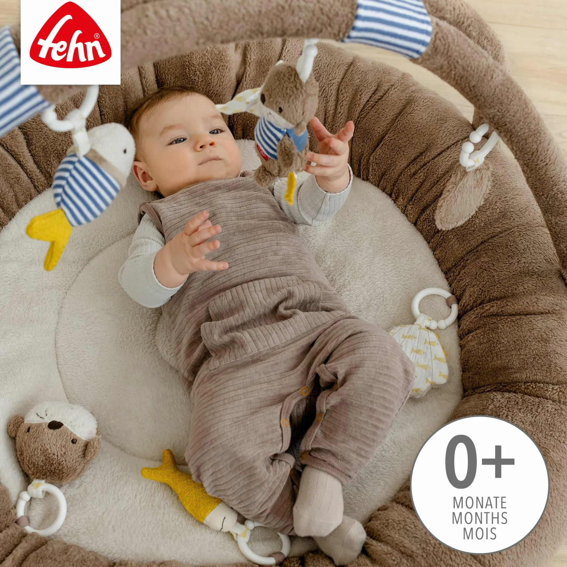 Auf dem 3-D-Activity-Nest Otter Theo von fehn gibt es für deinen Liebling viel zu entdecken. Der Otter Theo mit Glöckchen, der große Fisch mit Quietsche, der Rasselring oder der Spiegel sorgen für spannende Spielstunden, bei denen die sensorischen und motorischen Fähigkeiten deines Babys gefördert werden. Natürlich liegt dein kleiner Schatz dabei nicht auf dem harten Boden – vielmehr kann es sich dein Kind auf einer weichen Unterlage mit gepolstertem Rand gemütlich machen.