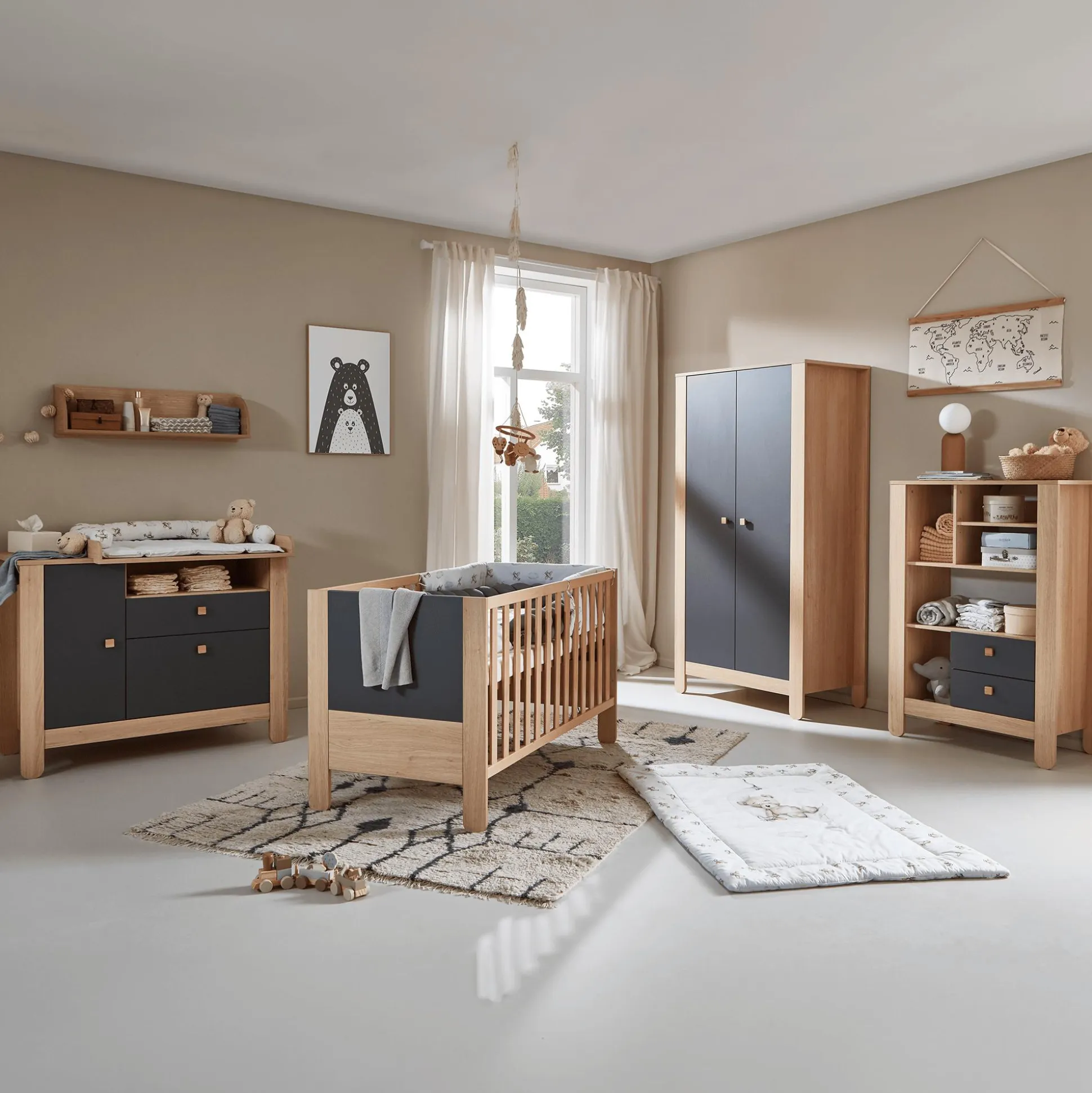 Doch auch das Design überzeugt: Die Kombination aus Nagano-Eiche und den anthrazitfarbenen Elementen wird in jedem Kinderzimmer zu einem echten Blickfang.