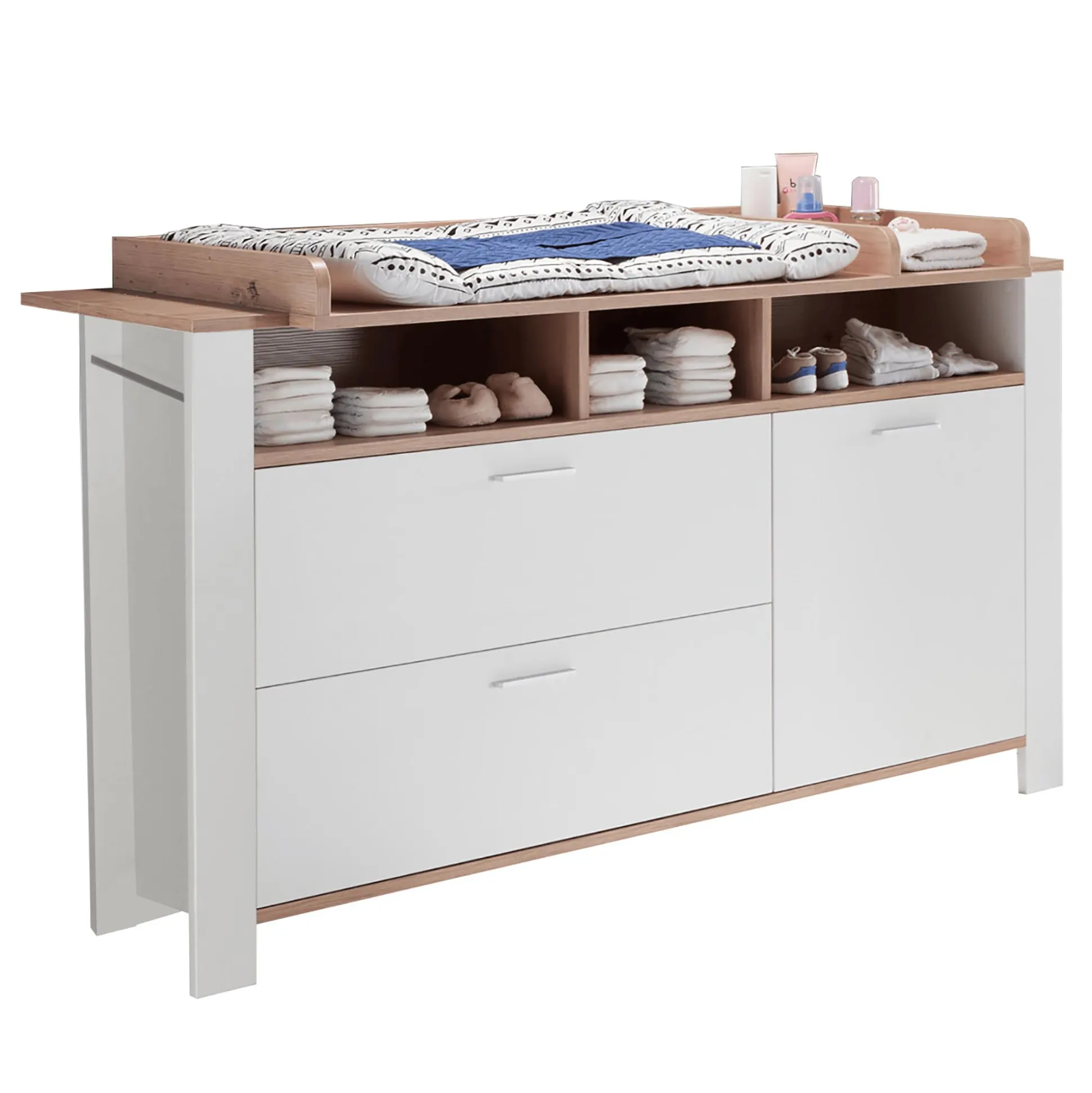 Mit der wunderschönen Wickelkommode inkl. Wickelaufsatz Alica von Mäusbacher erhältst du praktische Verstaumöglichkeiten für die Kleidung, Spielzeug und Schätze deines Kindes. Die zwei sanft schließenden Schubladen sind sehr geräumig und sorgen mit dem Selbsteinzug genauso wie die Tür mit einer Dämpfung für ein leises und sicheres Schließen. An der linken und rechten Seite der Wickelkommode befinden sich praktische Haltestangen und in den drei offenen Fächern können weitere Utensilien verstaut werden.