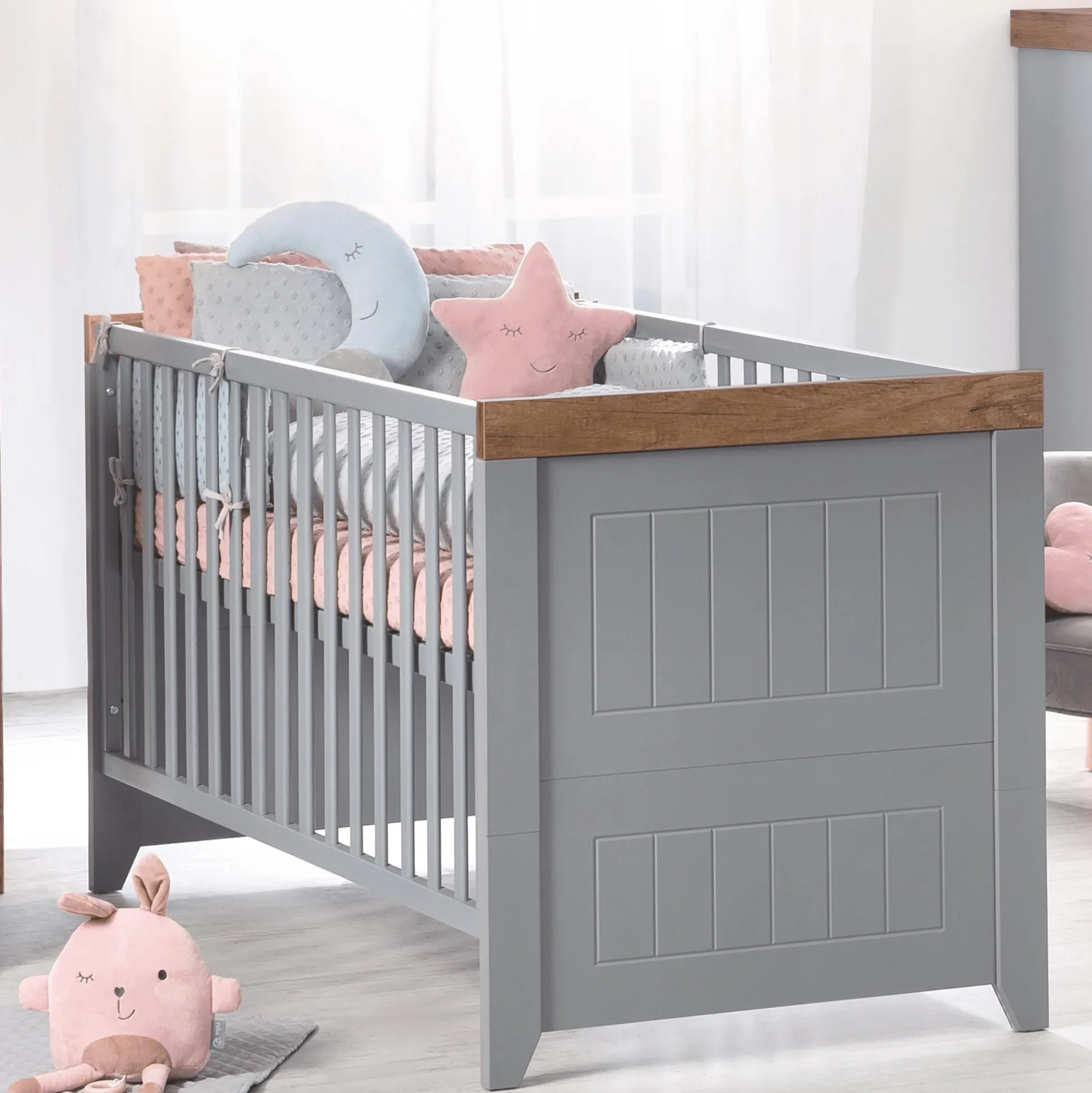 Das bezaubernde Kinderbett Ella bietet deinem Baby einen sicheren und geborgenen Schlafplatz sowie viele praktische Funktionen. Es ist 3-fach höhenverstellbar und verfügt über insgesamt drei herausnehmbaren Schlupfsprossen im Gitterelement. Mit den separat erhältlichen Umbauseiten kann das Kinderbett einfach zu einem Juniorbett umgebaut werden.