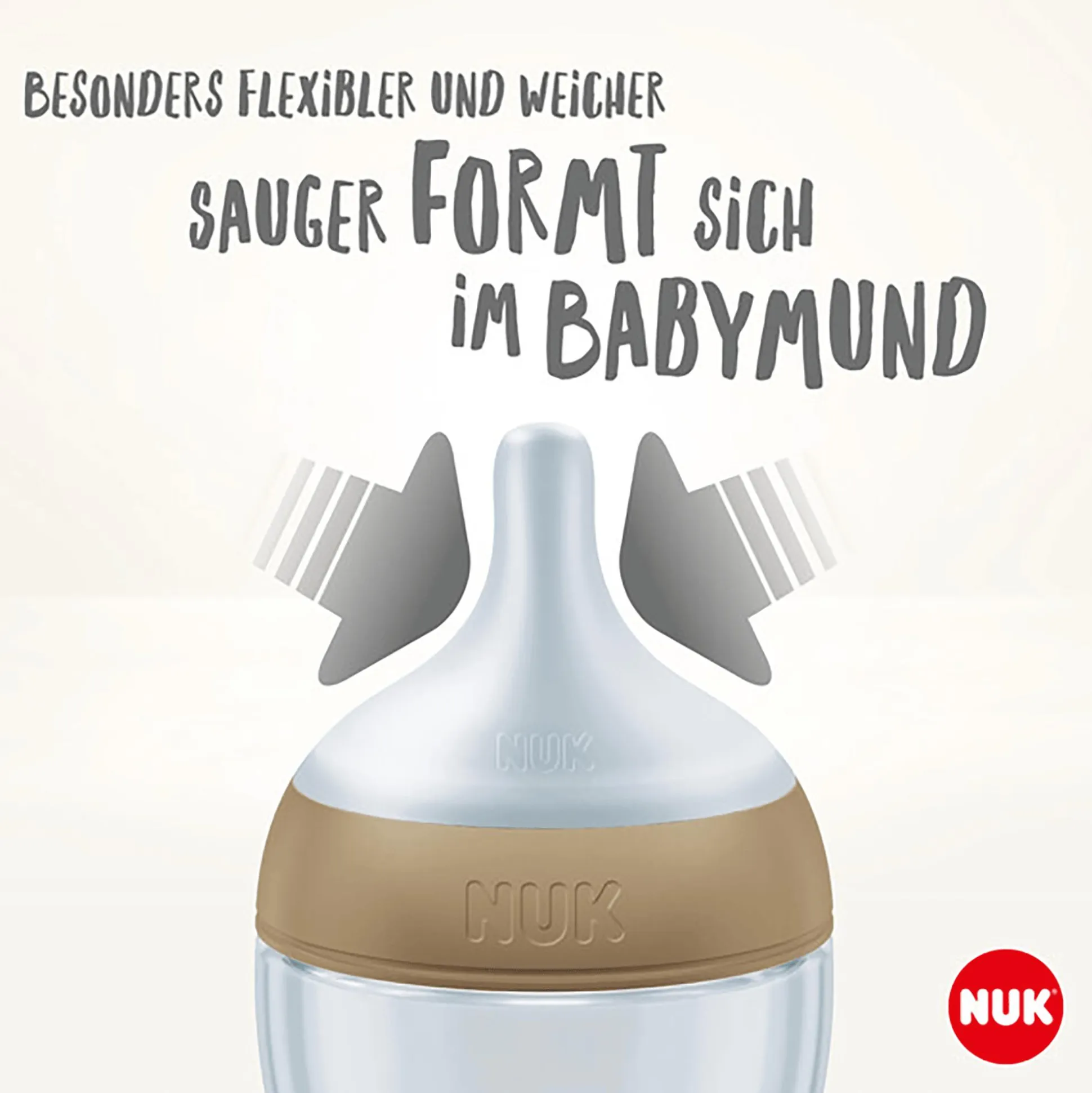 Das Set beinhaltet vier Flaschen aus robustem Glas: zwei mit ca. 120 ml Fassungsvermögen (Größe S, ab 0 Monaten, für Muttermilch) und zwei mit ca. 230 ml (Größe M, ab ca. 3 Monaten, für Milchnahrung). Zusätzlich gibt es einen Sauger in Größe U, der deinem Baby ab ca. 6 Monaten ermöglicht, die Nahrungsflussgeschwindigkeit selbst zu kontrollieren. Praktisch: Das Set ist kombinierbar mit allem Zubehör von NUK Perfect Match und NUK Soft&Easy Milchpumpen.