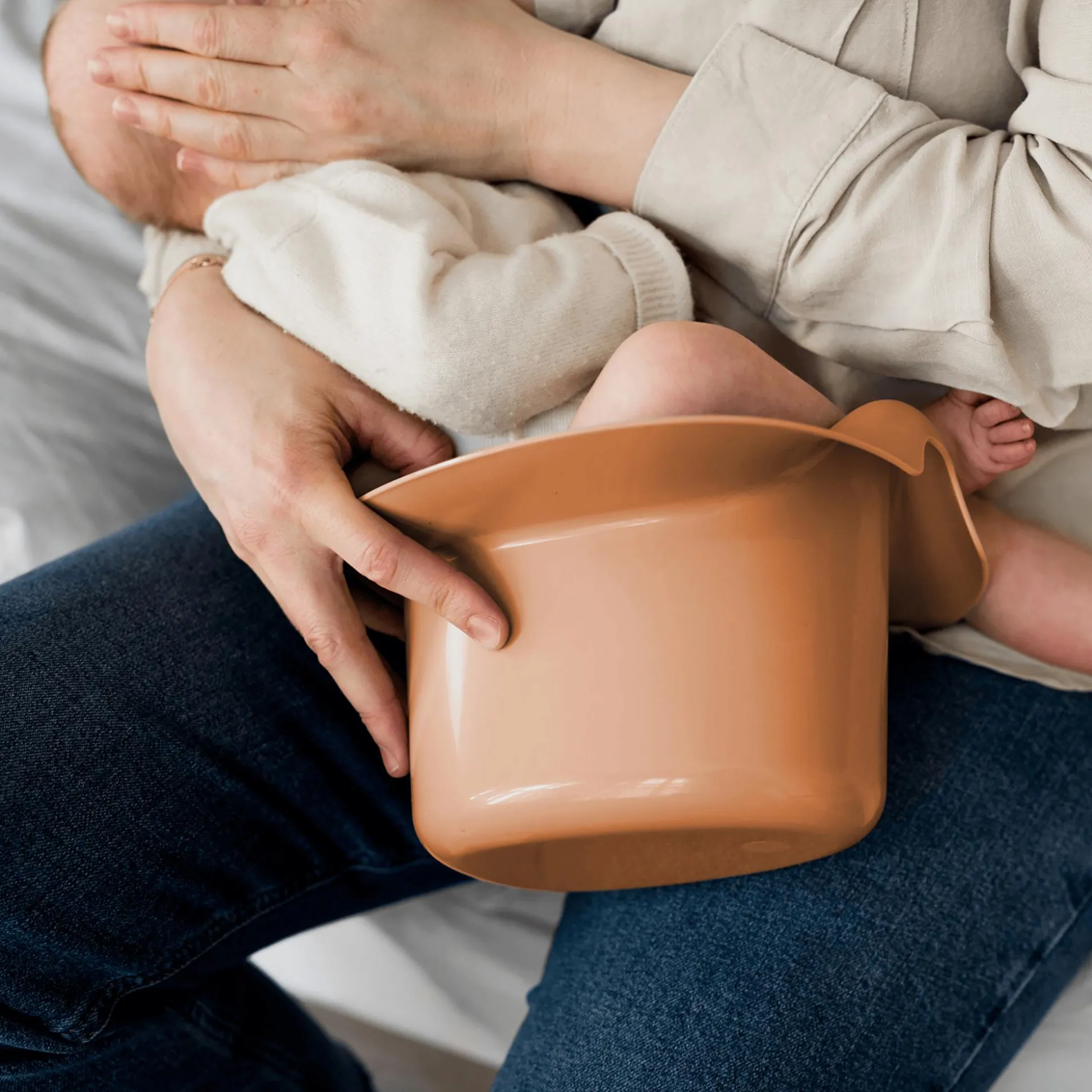 Die ergonomische Form des Einsatzes ist nämlich nicht nur zum darauf sitzen perfekt geeignet, wenn die Kleinen groß genug sind, eigenständig ein Töpfchen zu nutzen. Bereits als Abhalte-Töpfchen schmiegt sich die Form schon passend an den Po von Jungen und Mädchen an: die Pipi-Wand passt zwischen die Beine des Babys und verhindert, dass etwas daneben geht. Die breite Krempe sorgt für einen gemütlichen Sitz und die Möglichkeit, sich abzustützen. Die flache Unterseite sorgt für Stabilität, sowohl stehend als auch im Schoß der Eltern.