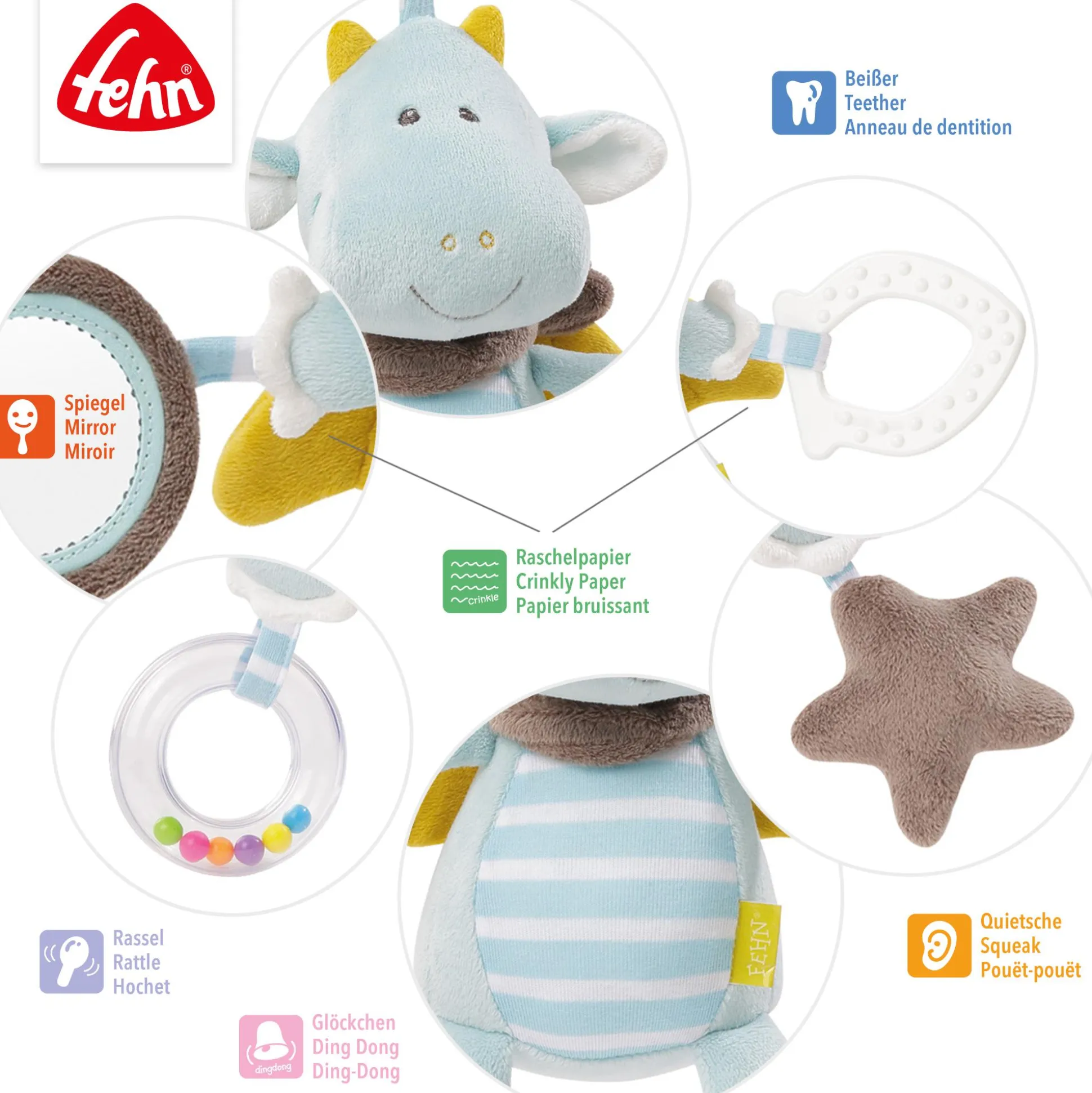 Abwechslungsreiche weiche Materialien in schönen Blautönen laden zum Tasten, Fühlen und Knuddeln ein. Der Softbeißer mit Noppenstruktur unterstützt das Baby beim Zahnen. Die Ringrassel mit bunten Perlen und die verborgene Quietsche im Stern wecken mit Geräuschen Babys Neugier, fördern das gezielte Greifen und animieren zum Schütteln und Spielen. Der kleine integrierte Spiegel ist perfekt für das lustige Guck-Guck-Spiel. Wenn der Drache schaukelt, klingelt das Glöckchen fröhlich in seinem Bauch.
