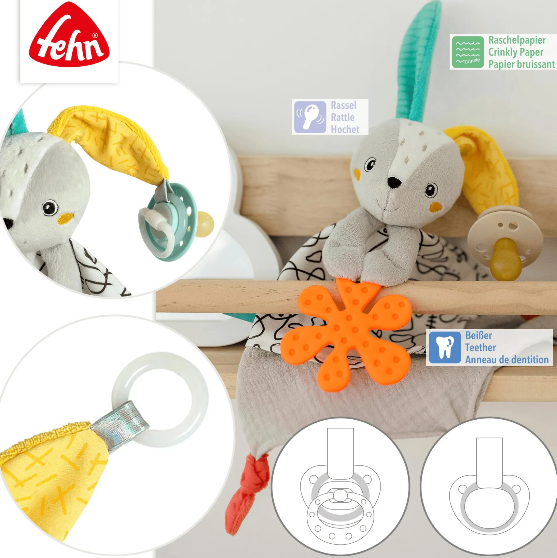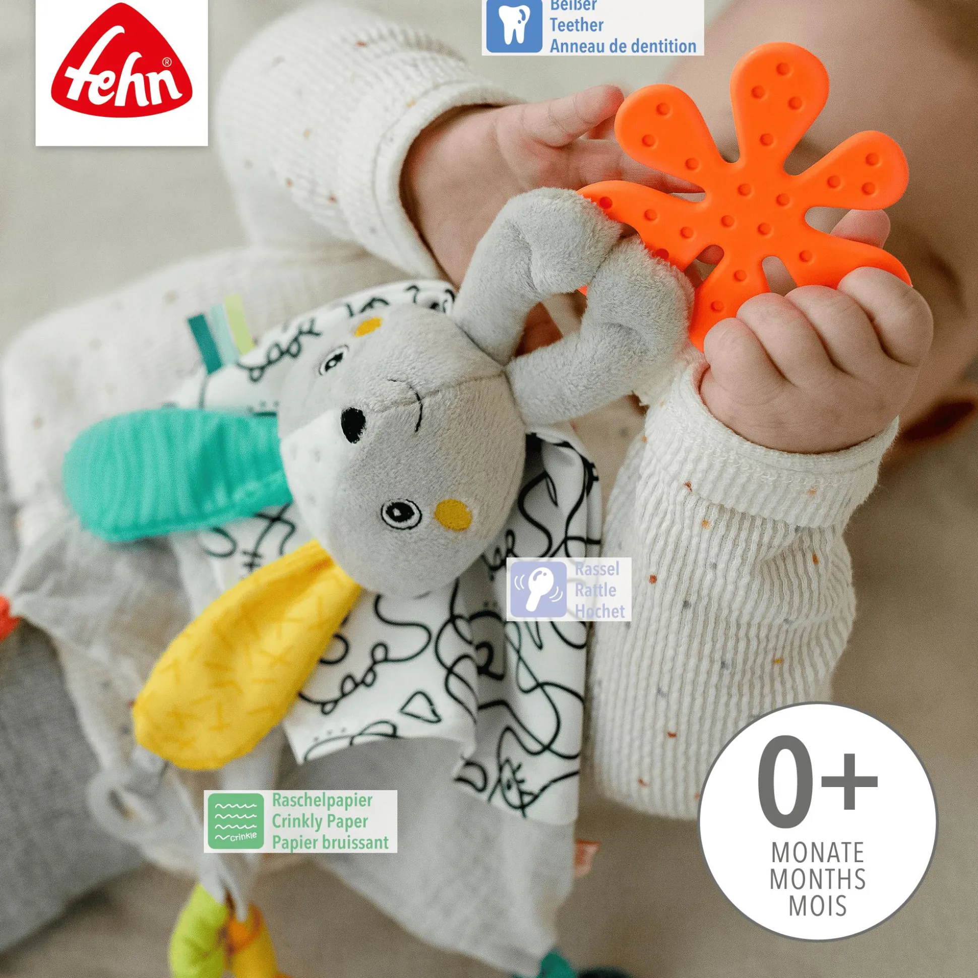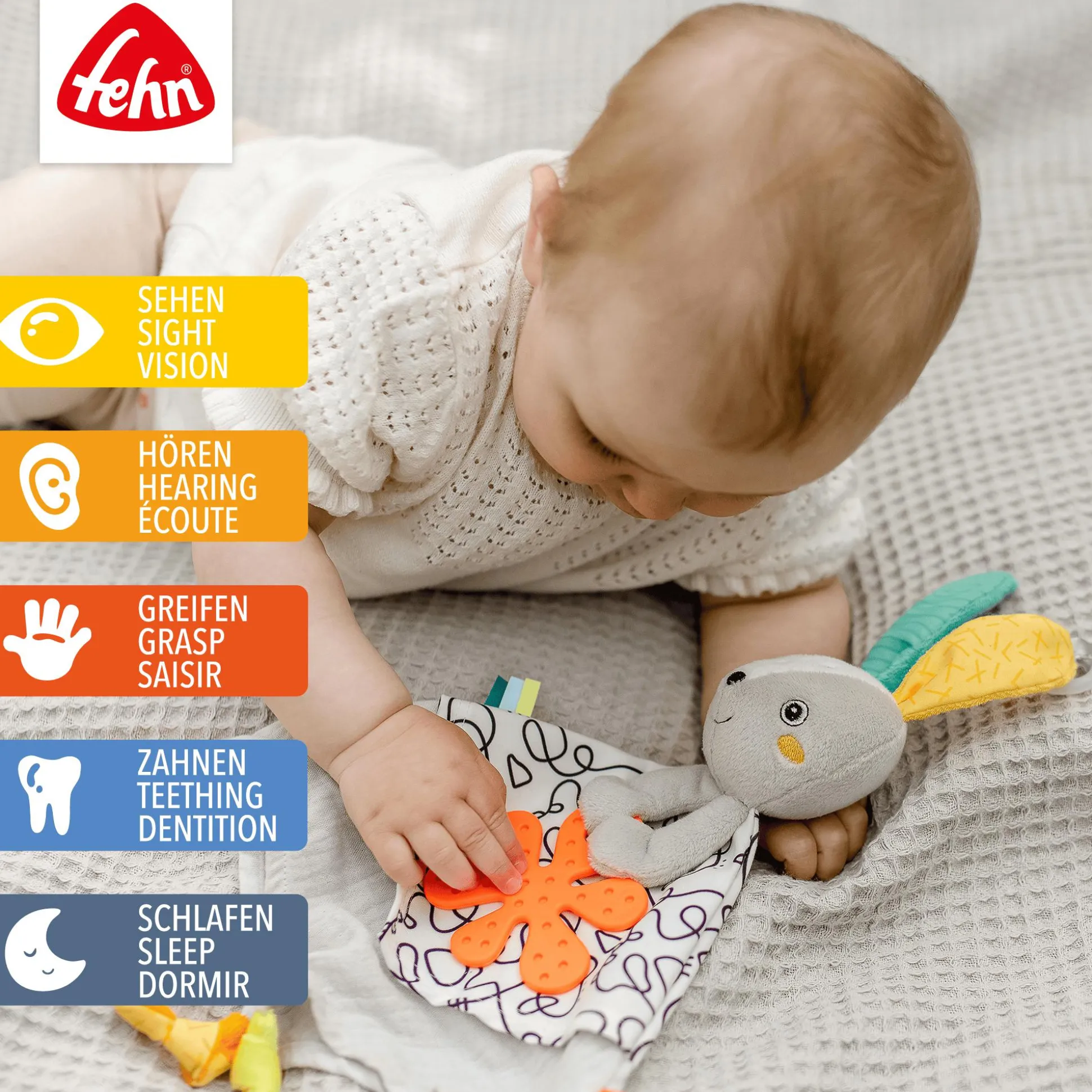 Das Activity-Schnuffeltuch Hase von fehn ist mit vielen spannenden Funktionen ausgestattet, die die Sinne deines Kindes fördern und seine Neugier wecken. Es verfügt über eine eingebaute Rassel, die sanfte Geräusche erzeugt und so die akustische Wahrnehmung trainiert. Das Raschelpapier im Inneren sorgt außerdem für zusätzliche Stimulation und regt den Tastsinn an. Die Beißer bieten deinem Baby Linderung beim Zahnen und fördern die motorische Entwicklung.