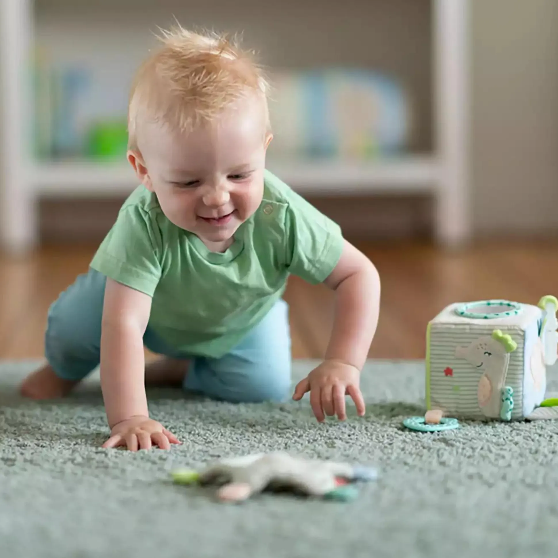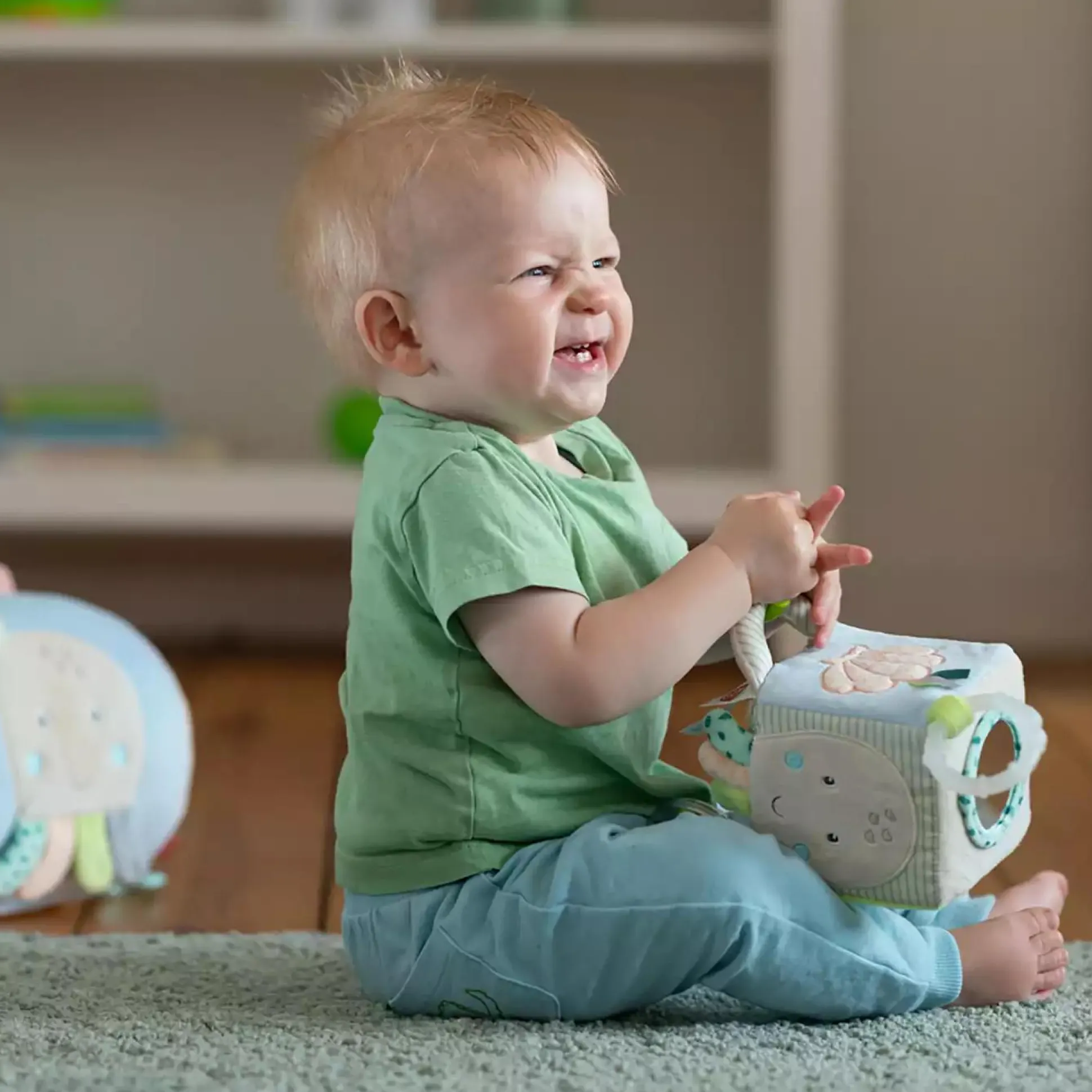 - sanfte Farben und Anhänger wie Softbeißer und Greifring laden zum Erkunden ein