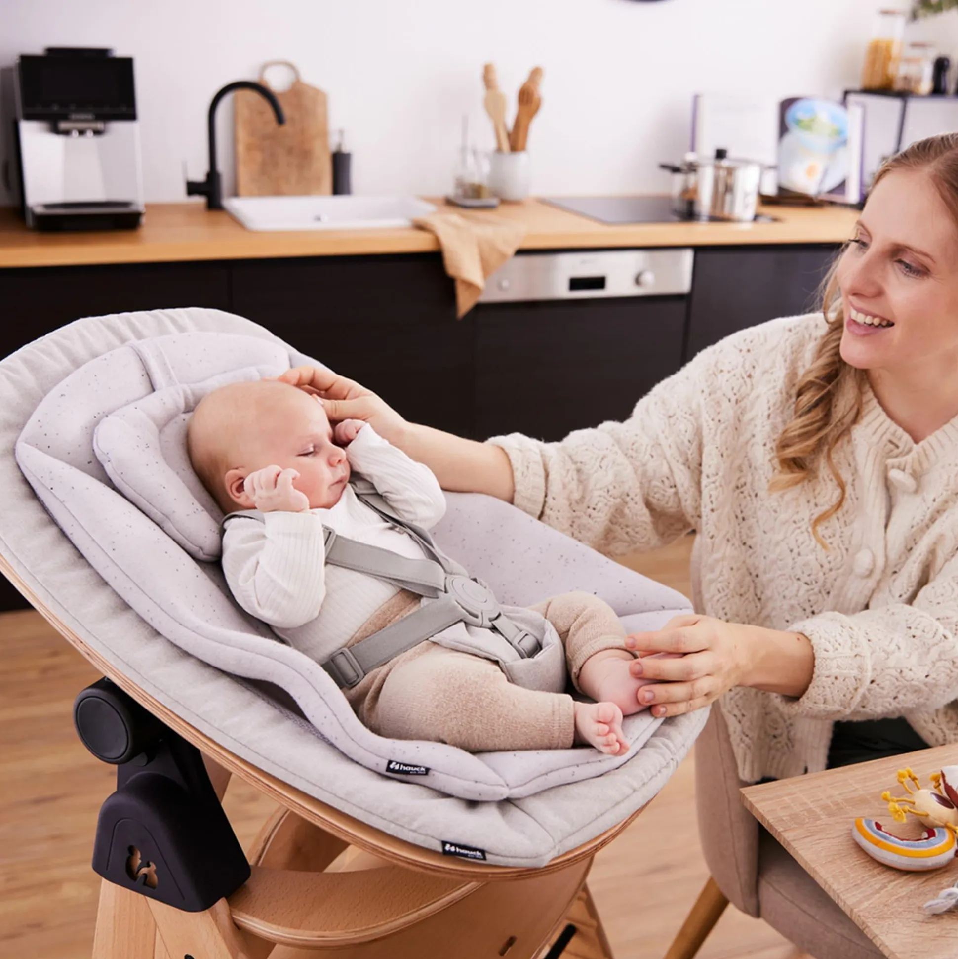 Du möchtest deinen Arketa Hochstuhl von hauck bereits für dein Neugeborenes nutzen? Mit dem Arketa Adapter ist das kinderleicht möglich! Einfach den Bouncer Eco Hochstuhlaufsatz auf den Arketa Hochstuhl klicken – schon sitzt dein kleiner Schatz sicher und bequem auf Augenhöhe mit dir und kann am Familienleben teilnehmen.