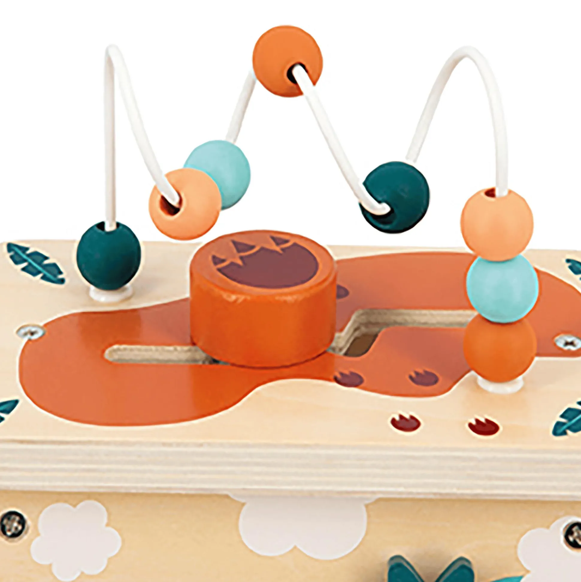 Auf der Rückseite befinden sich drei Zahnräder, die dein Kind drehen kann. So wird ihm das Prinzip von Ursache und Wirkung vertraut gemacht. Die linke Seite der Kiste hält einen Spiegel bereit, in dem sich dein Mini beim Spielen selber beobachten kann. Auch die Oberseite des Spielzeugs bietet eine Menge Spaß: Die Holzperlen der Motorikschleife sowie ein Labyrinth regen die Sinne an und schulen außerdem die Feinmotorik.