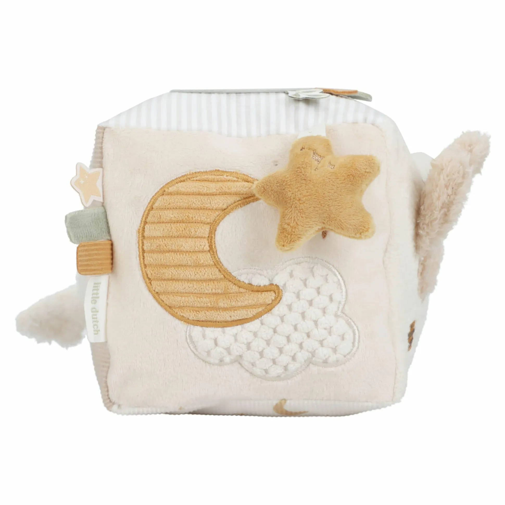 Der Aktivitäten-Würfel Newborn Naturals von Little Dutch verzaubert mit knisternden Stoffen, fühlbaren Etiketten und einem Spiegel und begleitet dein Baby von Geburt an auf spielerische Entdeckungsreise.