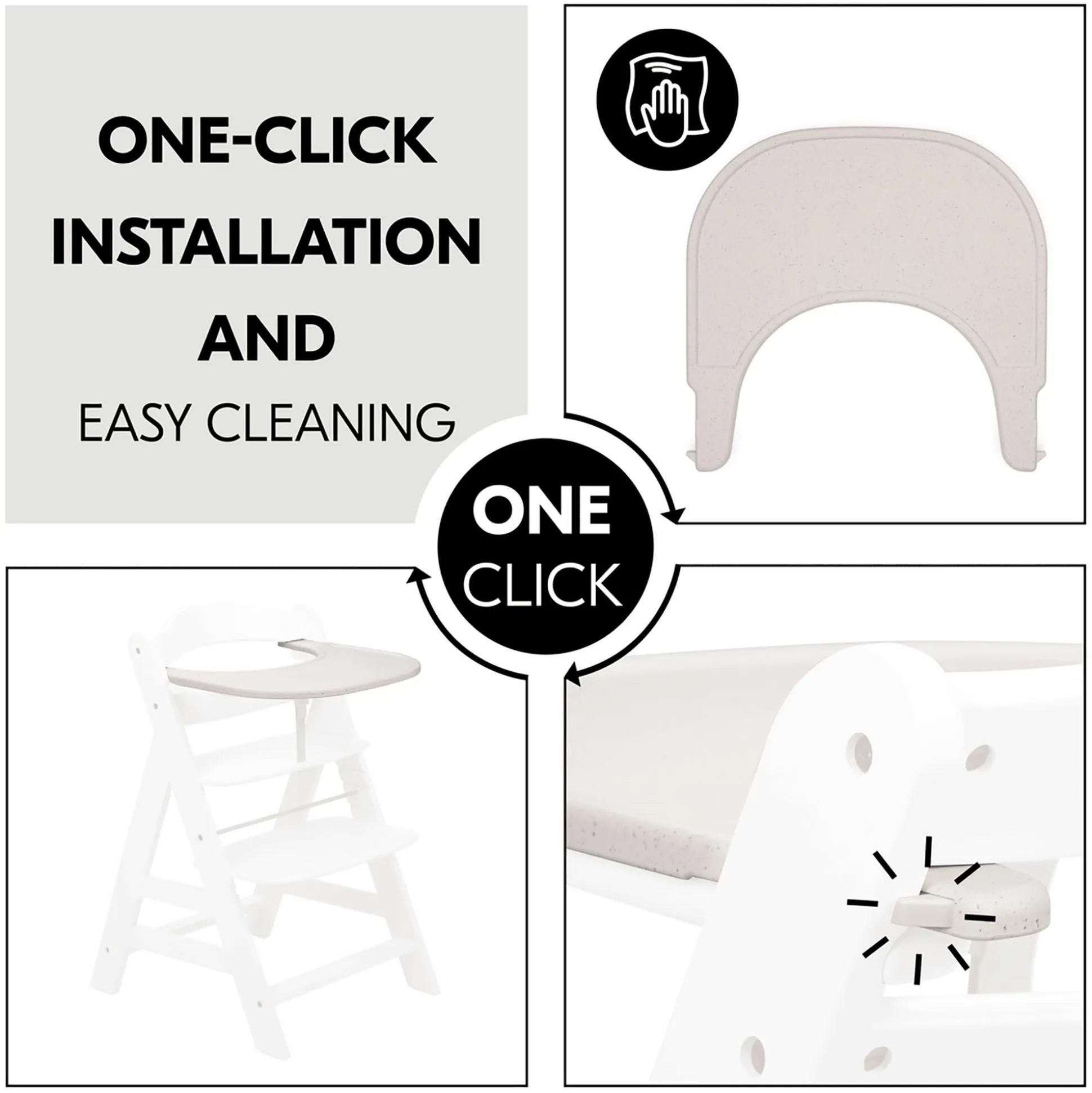 Das hauck Alpha Click Tray ist eine Erweiterung, die zum hauck Alpha+ Hochstuhl passt und jederzeit ergänzt werden kann. Mit nur einem Klick wird der Tisch am Alpha+ Holzhochstuhl mit einer Hand einfach, schnell und ohne Werkzeuge befestigt. Ideal, wenn du in der anderen Hand schon einen Teller hast. Egal, ob eine Mahlzeit alleine am Tray oder gemeinsam mit der Familie am Esstisch eingenommen wird, die einfache Anbringung geht super schnell und es kann spontan darüber entschieden werden. So wird der mitwachsende Hochstuhl noch flexibler.