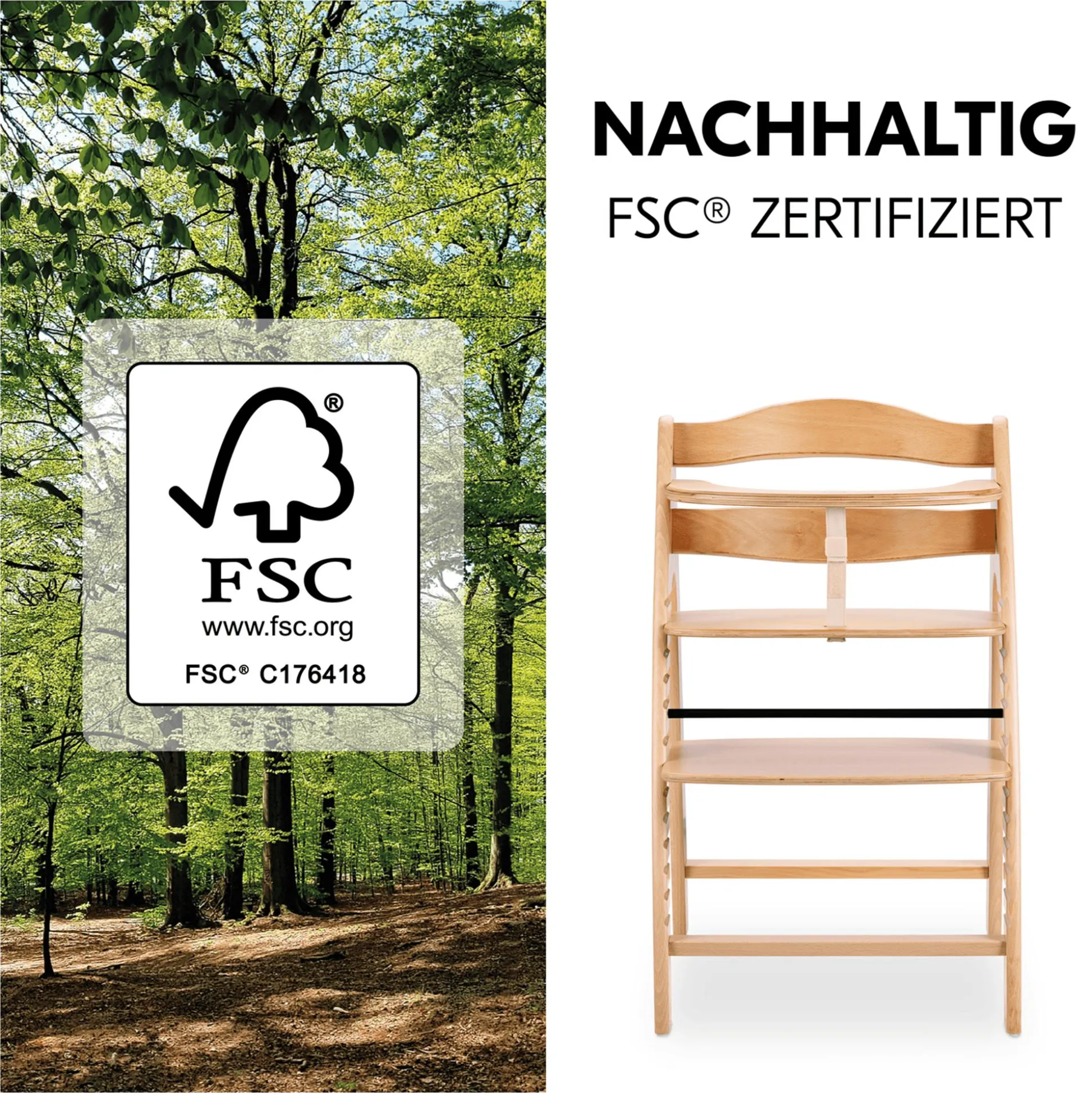Alles, was dein Kind braucht, um sicher zu sitzen, ist dabei: Schrittgurt, 5-Punkt-Gurt und Vorderbügel. Kippsicher konstruiert ist der Arketa auch – selbst wenn sich dein Kind vom Tisch abstößt, rutscht der Stuhl durch die Bodengleiter sanft nach hinten und bleibt stabil. Nachhaltigkeit ist dir wichtig? Der Arketa wird aus langlebigem, hochwertigem Holz gefertigt, das aus FSC®- zertifizierten Wäldern stammt. Dies sorgt für eine nachhaltige Waldnutzung und schützt Tiere und Pflanzen.