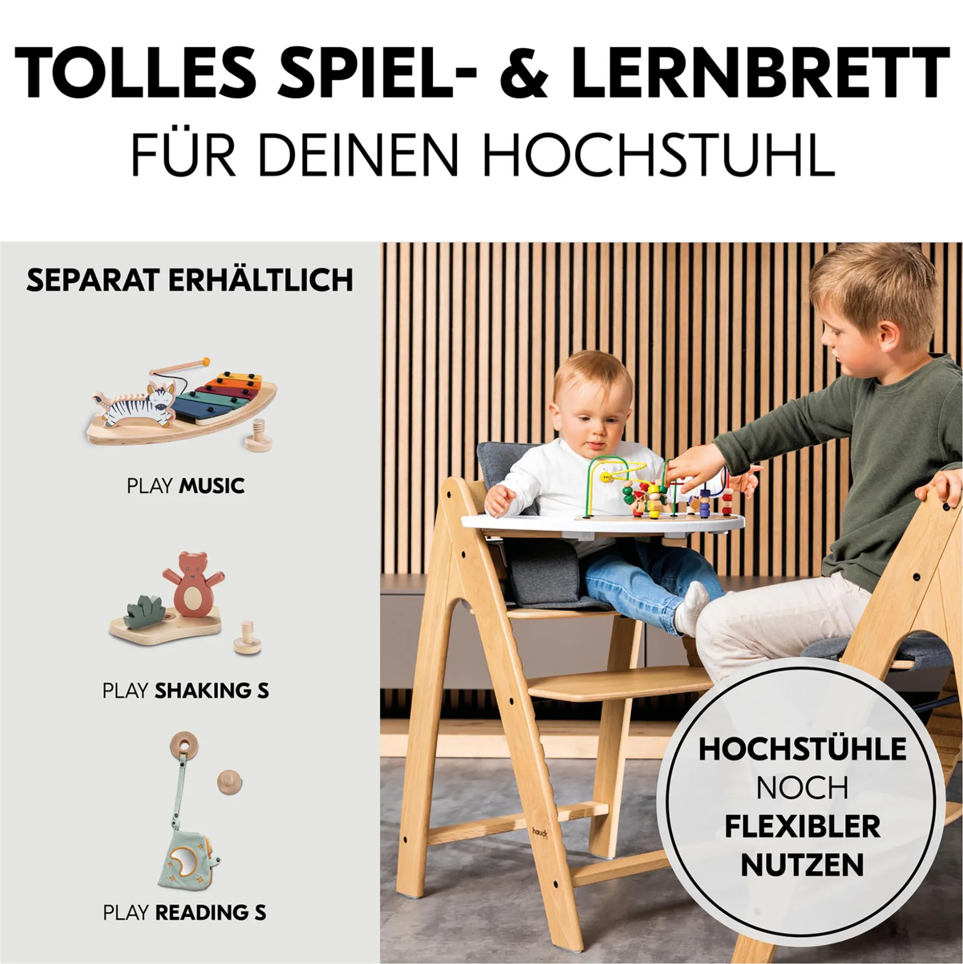 Mit dem Play Tray von Hauck kannst du deinen Arketa Hochstuhl noch flexibler nutzen, denn es bietet deinem Kind die ideale Beschäftigung während du kochst oder anderen Tätigkeiten nachgehst. Das Spiel- und Lernbrett ist mit bis zu drei separat erhältlichen Spielaufsätzen kombinierbar, die deinem Kind jede Menge Spielspaß bereiten und gleichzeitig motorische sowie visuelle Fähigkeiten trainieren.