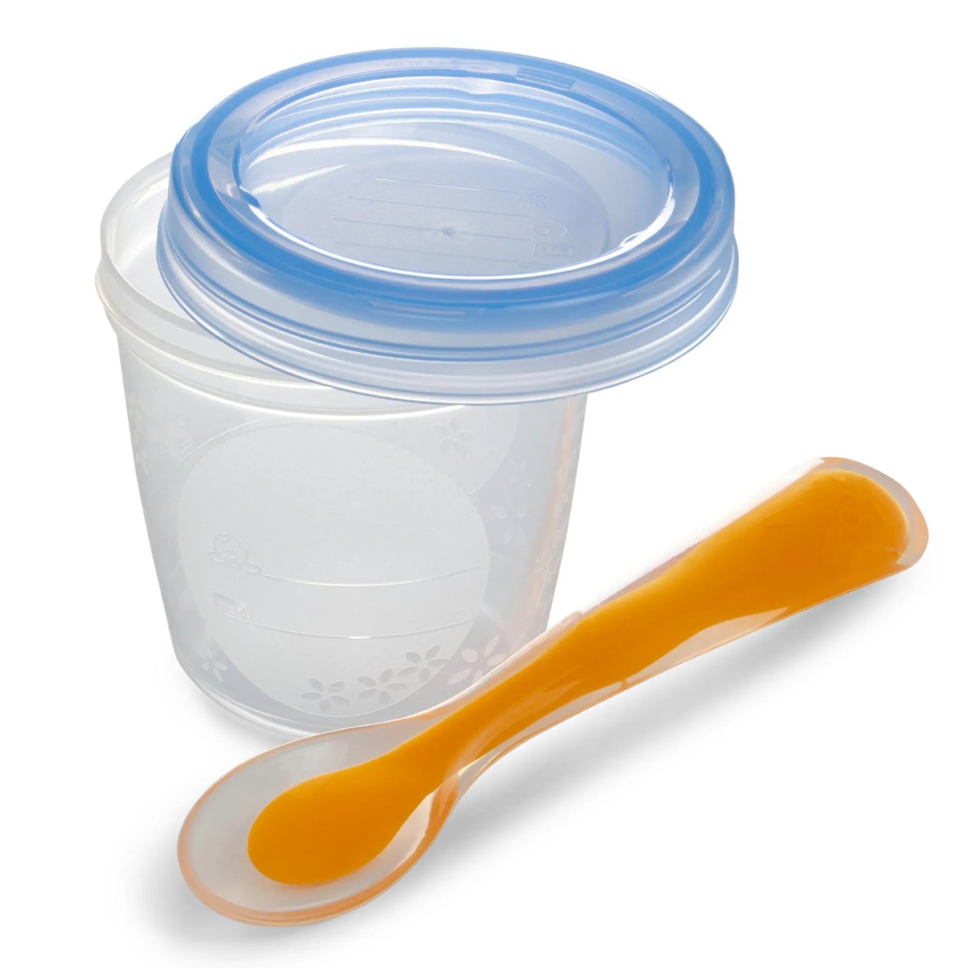 Die Nahrungs-Mehrwegbecher SCF721/20 im Set von Philips Avent überzeugt mit den gefrier- und hitzebeständigen Eigenschaften. Ein babygerechter Löffel ist in dem praktischen Set enthalten. Die frische Babynahrung kannst in den Mehrwegbechern portioniert verwahren und bei Bedarf einfach im Flaschenwärmer oder der Mikrowelle erhitzen. Dank den auslaufsicheren Deckeln ist das Set auch für unterwegs ideal geeignet.