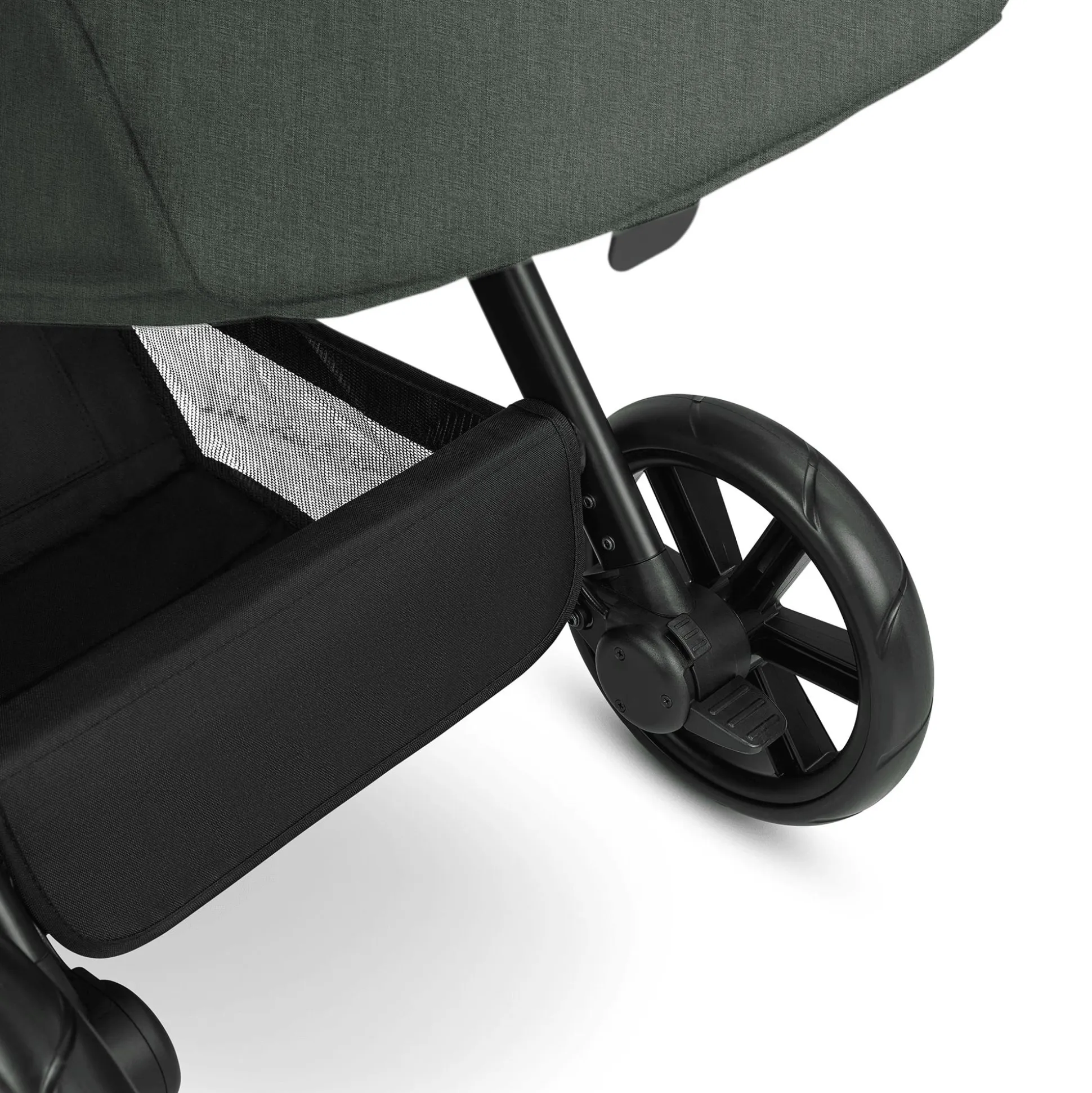 - Feststellbremse am rechten Hinterrad: ohne Hinterachse bietet der Buggy mehr Beinfreiheit beim Schieben