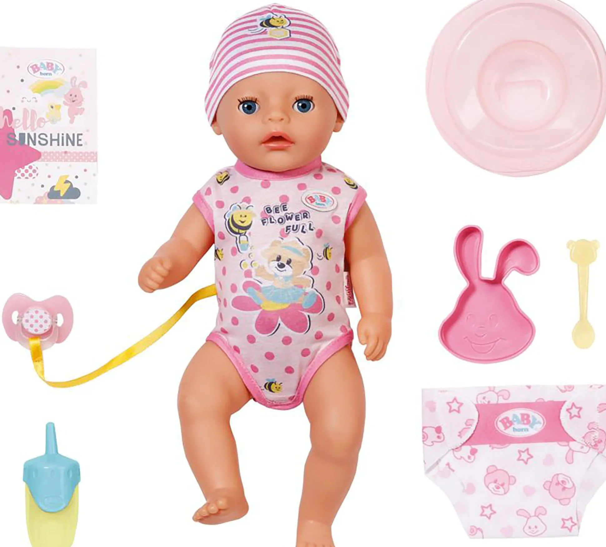 - mit 7 lebensechten Funktionen: Töpfchen, Stoffwindel, Flasche, Teller mit Löffel, Schnuller und Geburtspass