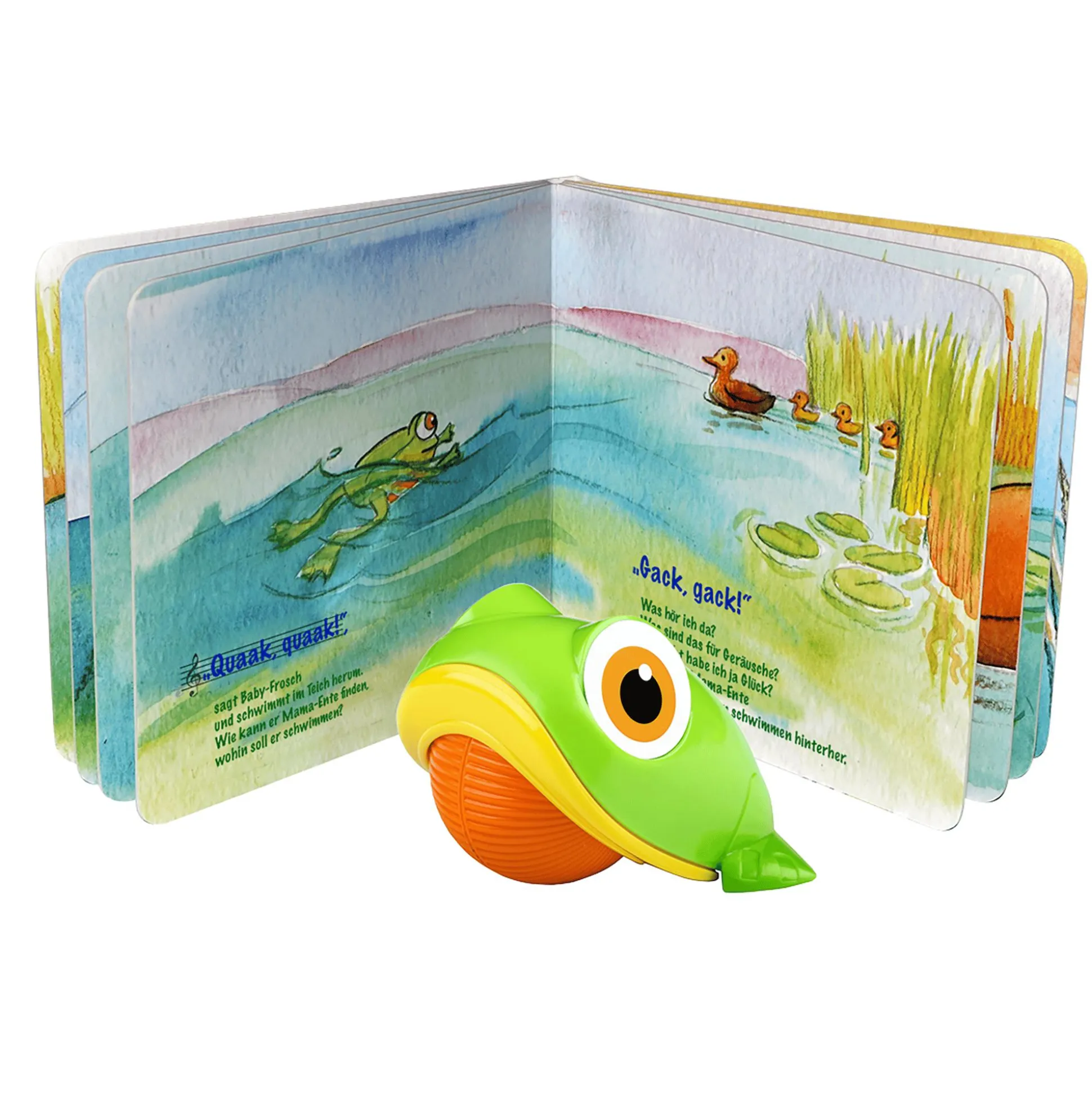 Dein kleiner Liebling kann interaktiv mitmachen, mit der Ente quaken, mit der Libelle fliegen und mit dem Fisch schwimmen. Das Besondere: Durch das Rollen auf der Unterseite des Frosch-Rollers wird ein bezauberndes quakendes Frosch-Geräusch erzeugt. Diese kreative Mitmach-Geschichte ermöglicht es deinem kleinen Schatz, spielerisch die Grundlagen des Musizierens zu entdecken, Rhythmen zu erkennen und sogar selbst zu erfinden.