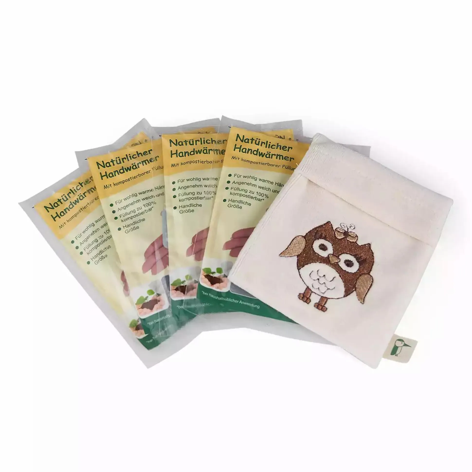 Mit dem Baby-Wärmer von Grünspecht hat es dein Baby im Kinderwagen oder der Trage wohlig warm – ob als Körperwärmer auf Brust und Bauch oder als Fußwärmer bei kalten Füßchen. Dazu einfach einen der beiliegenden „Natürlichen Handwärmer“ als Wärmepad in die Einlegetasche der flauschigen Kissen-Hülle aus 100 % Baumwolle (aus kontrolliert biologischem Anbau) einschieben. Der Wärmer erwärmt sich anschließend durch Kontakt mit Sauerstoff innerhalb von 15 Minuten von selbst und bietet bis zu 5 Stunden angenehme Wärme für deinen Schatz. Das niedliche Eulen-Motiv macht diesen Wärmer außerdem zu einem echten Hingucker.