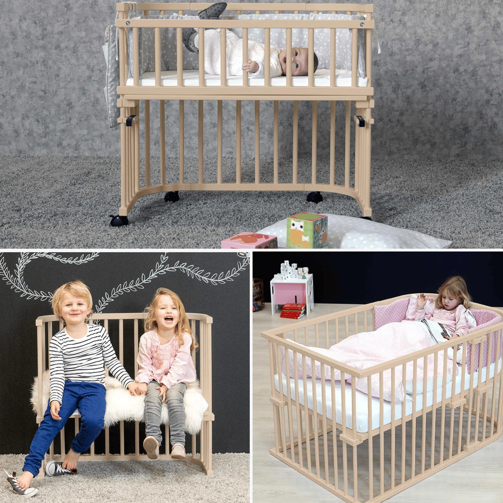 Aber das ist noch nicht alles: Dieses Beistellbett ist ein echtes Multitalent. Es kann nicht nur in eine gemütliche Sitzbank oder einen kreativen Spieltisch verwandelt werden, sondern mit dem optionalen Zubehör auch in einen Stubenwagen oder sogar einen praktischen Kinderstuhl. So wächst es mit den Bedürfnissen deiner Familie und bietet immer den perfekten Platz für dein Kind.