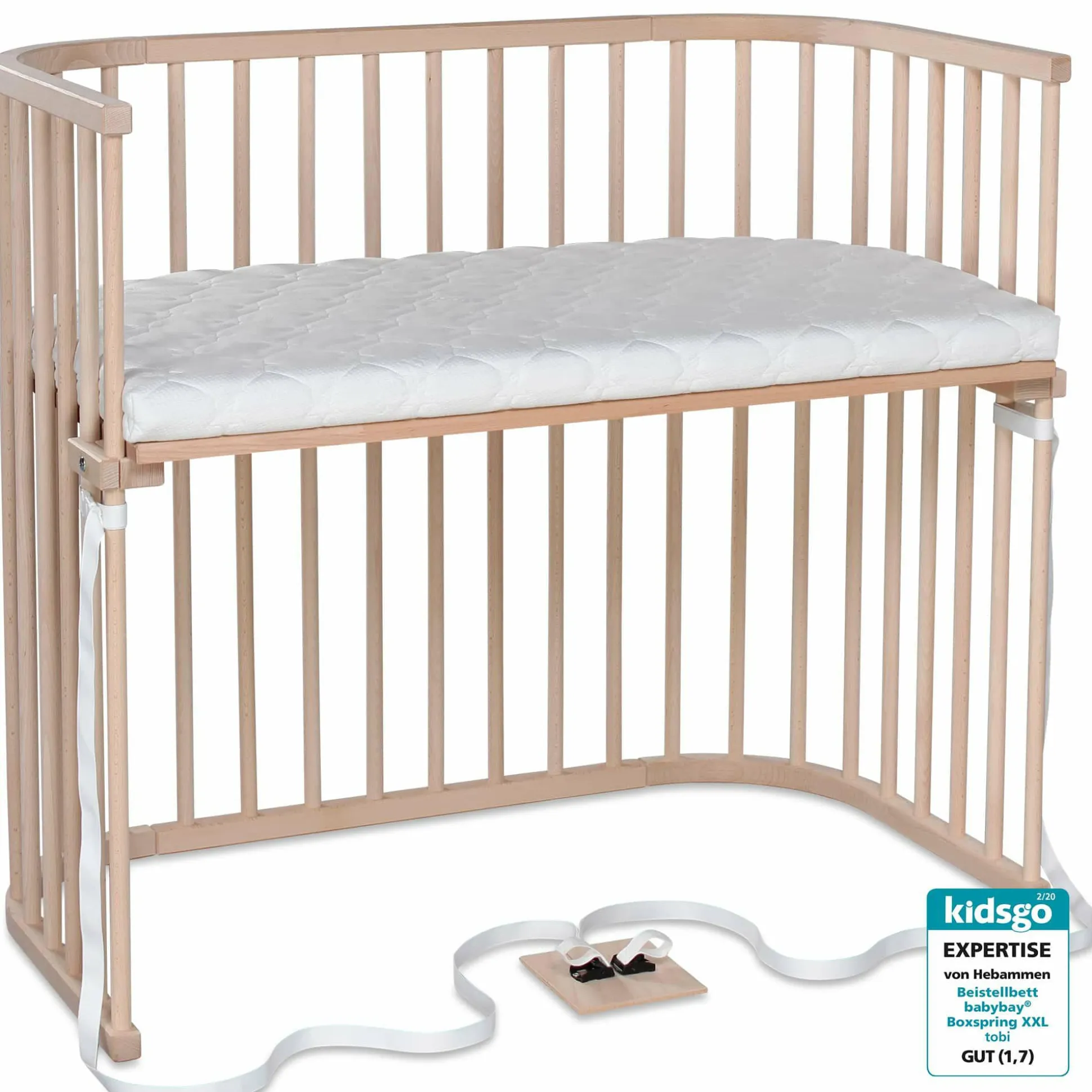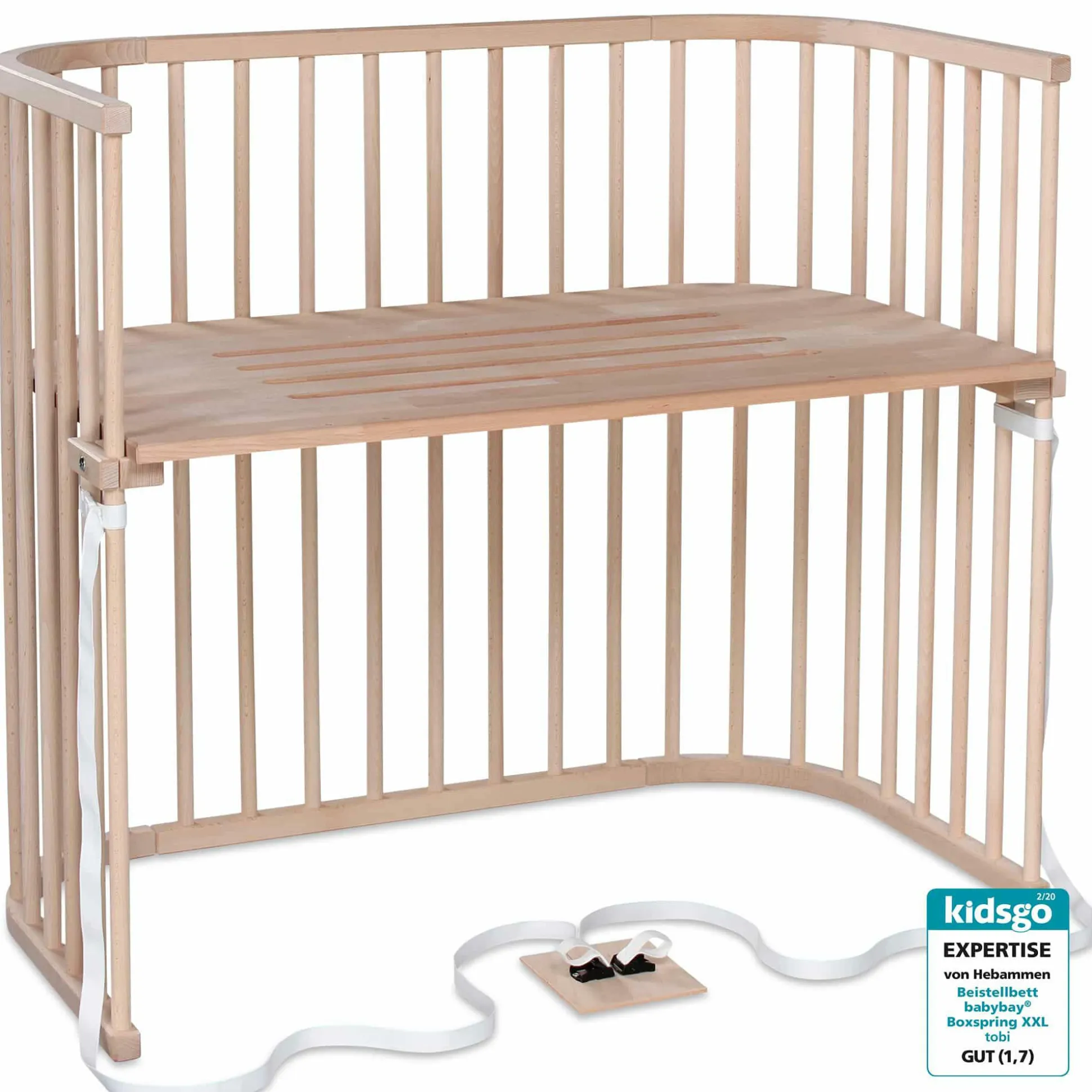 Das babybay® Boxspring XXL natur von tobi ist die perfekte Lösung für alle hohen Betten. Aufgrund der hohen Bauweise und der patenten stufenlosen Höhenverstellung lässt sich die Liegefläche exakt an hohe und rahmenlose Boxspring-Betten anpassen – ohne Stufe, ohne Spalt. Immer bündig auf einer Ebene mit Mamas Bett – das A und O eines Beistellbetts. Gerade in den ersten Monaten ist der enge Kontakt zwischen dir und deinem Baby sehr wichtig, mit der extra großen XXL Liegefläche, kannst du die Nähe zu deinem kleinen Liebling noch länger genießen. babybay® Boxspring XXL ist daher auch ideal für Zwillinge geeignet. Mit der speziellen Gurtbefestigung lässt es sich kinderleicht, sicher und werkzeuglos an jedem Boxspringbett befestigen und wieder lösen. Die Lacke sind schadstofffrei und entsprechen den Normen EN71.3. Das Buchenholz stammt aus nachhaltig bewirtschafteten, heimischen Wäldern. Es wird komplett aus natürlichem, antibakteriellem und antistatischem Buchenvollholz gefertigt – ohne Kompromisse, ohne Holzersatzstoffe.