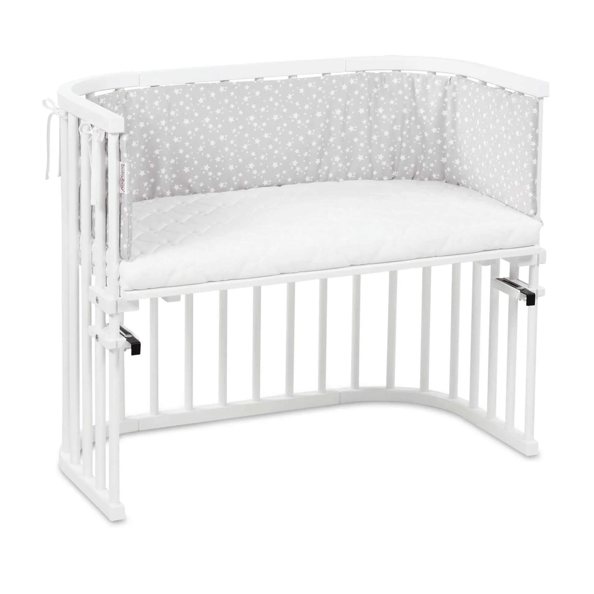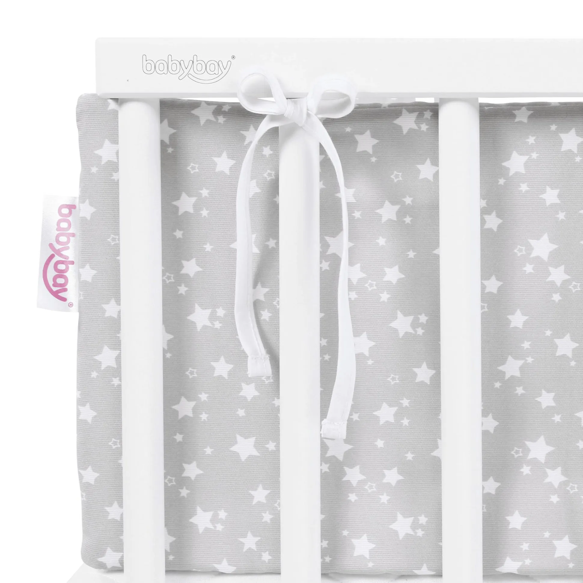Mit diesem schönen Nestchen wird aus babybay® ein ganz individuelles Traumbettchen. Es ist passend für das babybay Bett Maxi, Boxspring und Comfort. Das Baby ist rundum geborgen und vor Umweltreizen,Zugluft und Gitterstäben geschützt. Das atmungsaktive Nestchen sorgt für eine optimale Luftzirkulation – nicht zu viel, nicht zu wenig. Durch Schleifen lässt sich das Nestchen leicht und sicher befestigen und zum Waschen jederzeit abnehmen. Das Nestchen ist auf Schadstoffe geprüft und mit dem Zertifikat „Textiles Vertrauen“ nach Ökotex-Standard 100 Klasse 1 für Babys ausgezeichnet. Ein wunderschöner Allover-Print mit Sternen verziert das Nestchen.