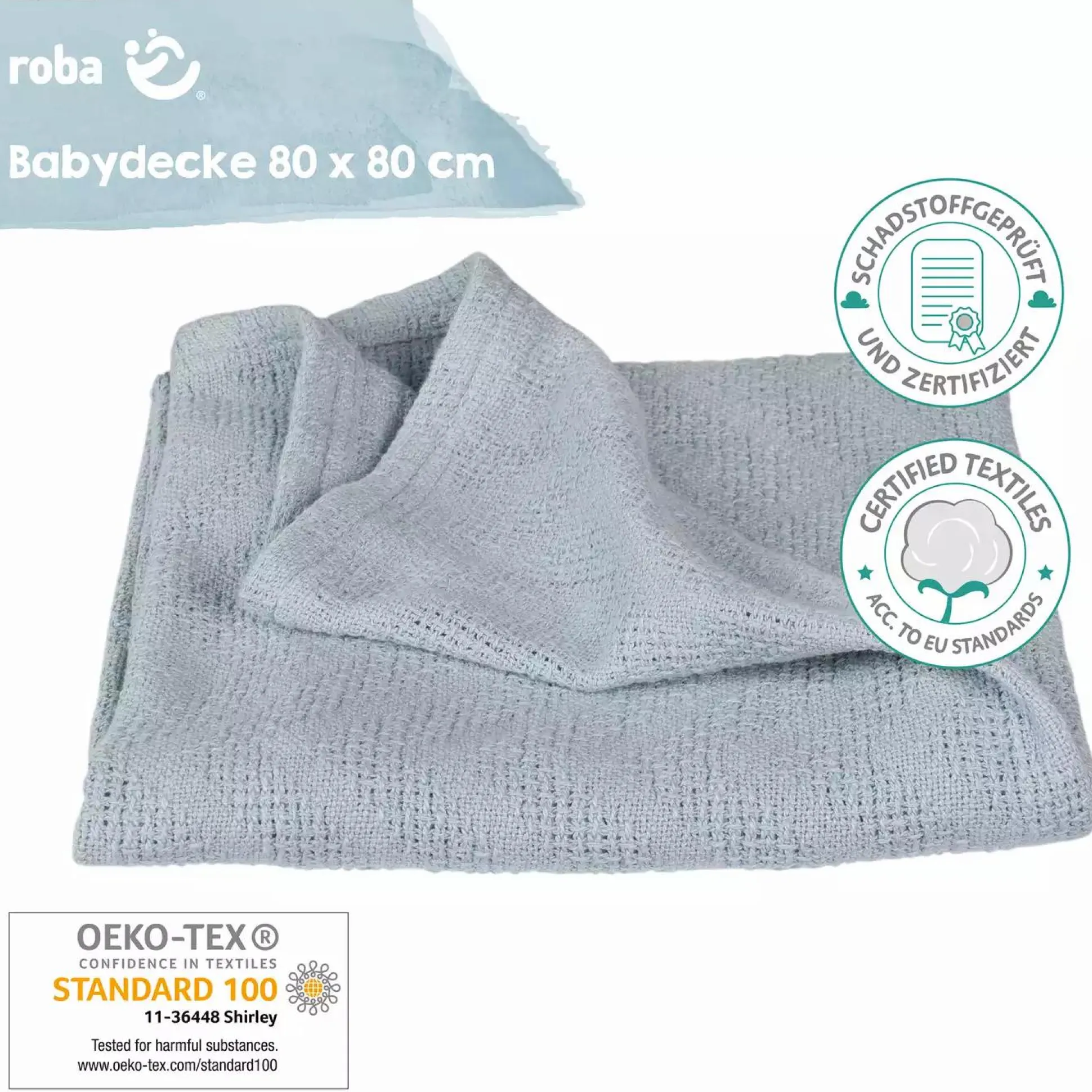Auch nach vielen umweltfreundlichen Wäschen bei 40°C behält die roba Babydecke in der trendigen Farbe hellblau / sky ihre Form und ihre superweiche Haptik – dank spezieller Oberflächenbehandlung und Vorwäsche bleibt sie superweich. Die Babydecke wird nachhaltig nach dem Global Organic Textile Standard GOTS und unter fairen und sozialen Bedingungen der Business Social Compliance Initiative (BSCI) hergestellt.