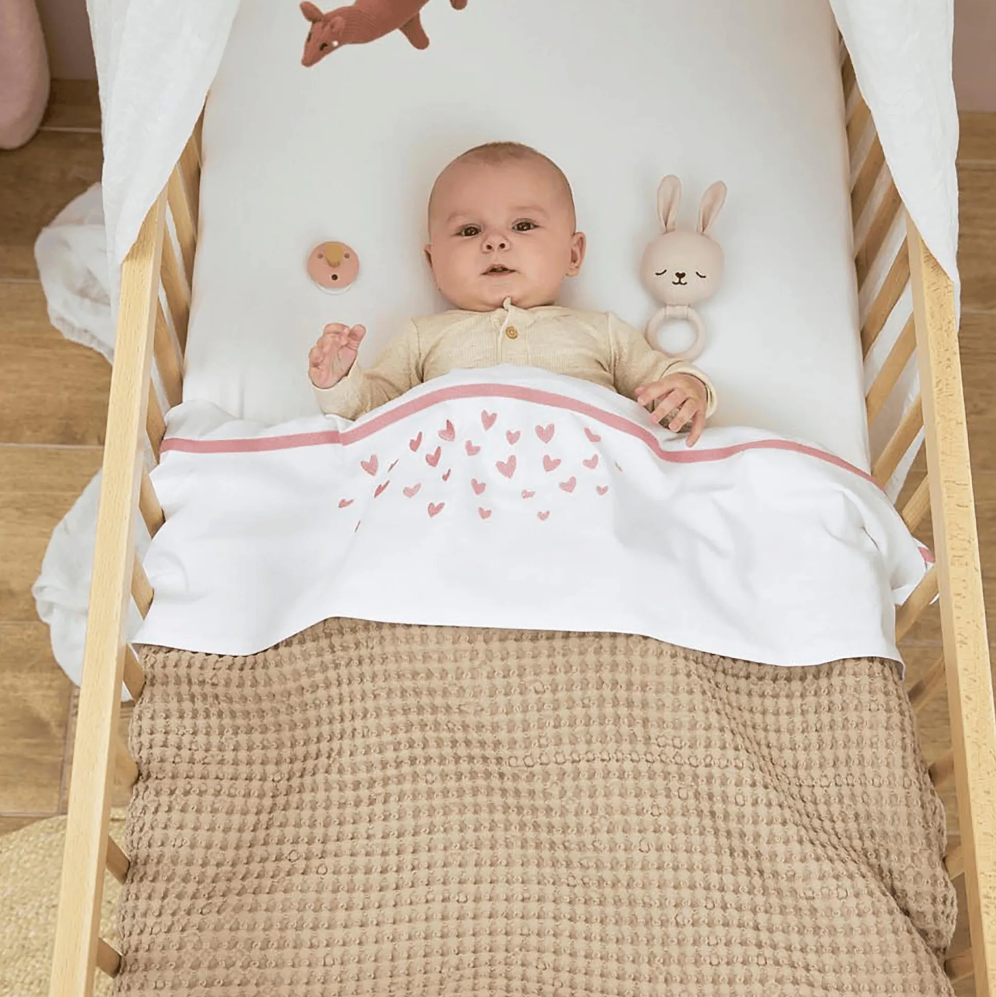 Die Meyco Decke Waffel Teddy in der Farbe Sand darf in der Babyausstattung nicht fehlen. Die luxuriöse Baumwoll-Waffelstruktur auf der Vorderseite der Decke sowie herrlich weiches Teddy-Fleece auf der Rückseite sorgen für zusätzlichen Komfort und Wärme. Die 75 x 100 cm große Babydecke von Meyco hat einen TOG-Wert von 2,0. Die vielseitig verwendbare Decke kann in der Wiege, in der Babyschale oder im Kinderwagen verwendet werden – anschließend eignet sie sich auch hervorragend als Kuscheldecke für die Couch oder das Bett!