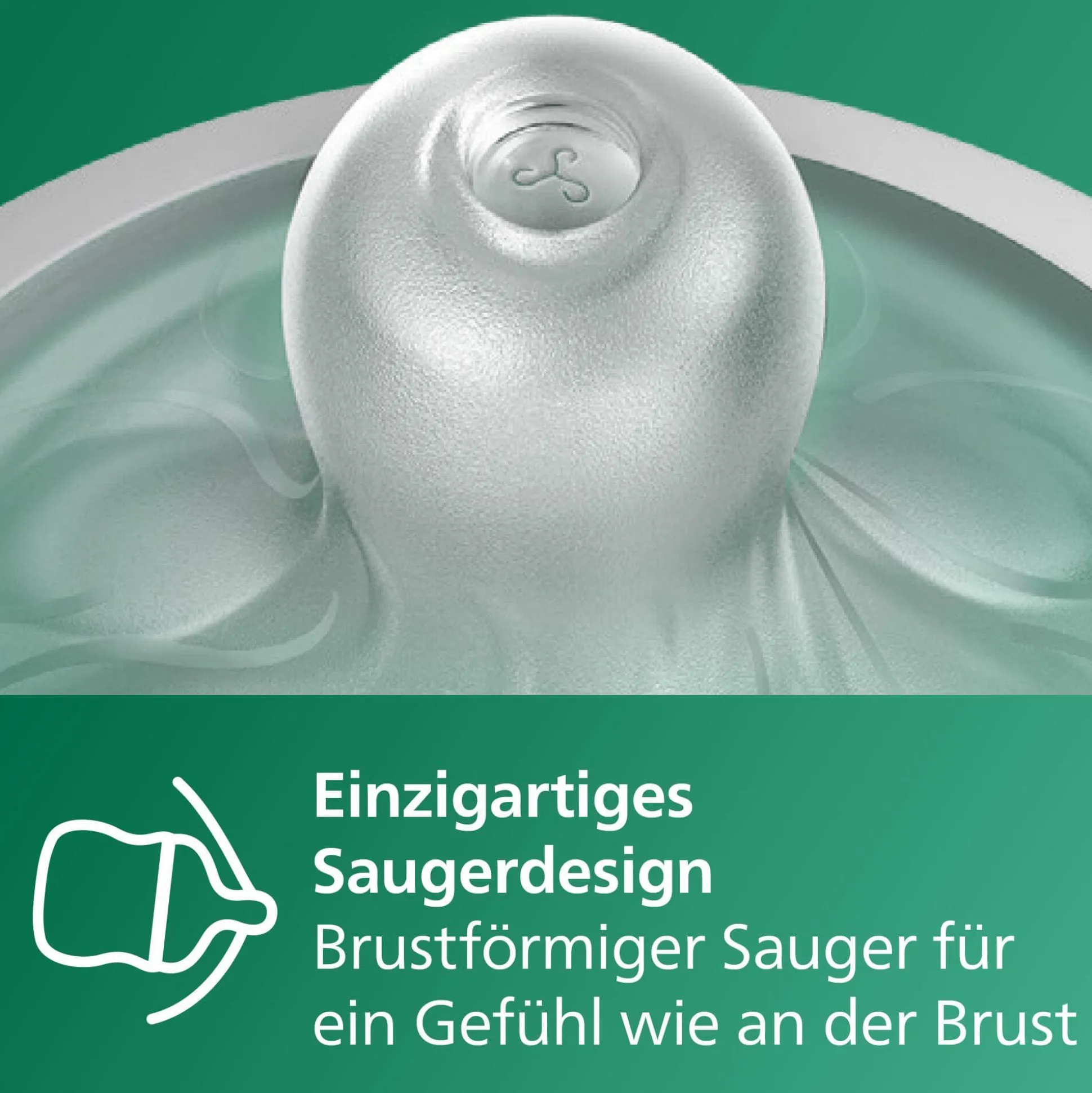 Die Philips Avent Natural Response Babyflasche SCY933/01 unterstützt den natürlichen Saugrhythmus deines Babys beim Saugen, Schlucken und Atmen. Der Sauger mit mittlerer Durchflussrate gibt Milch nur ab, wenn das Baby aktiv trinkt, wodurch Verschlucken verhindert und die Kombination von Stillen und Flaschenernährung erleichtert wird. Das Anti-Kolik-Ventil reduziert Koliken und Unwohlsein, indem Luft vom Bauch ferngehalten wird. Der breite, weiche Sauger imitiert die Brustform für naturnahes Trinken, während das hitzebeständige Borosilikatglas sicher im Kühlschrank gelagert, erwärmt und sterilisiert werden kann. Tropfsicheres Design, BPA-freie Materialien und einfache Reinigung sorgen für komfortables Füttern. Die Flasche besteht aus wenigen Teilen und lässt sich schnell zusammensetzen. Verschiedene Saugerstufen ermöglichen die Anpassung an das individuelle Trinkverhalten. Gib dem Baby Zeit für die Umgewöhnung, damit das Fütterungserlebnis ruhig, entspannt und sicher verläuft.