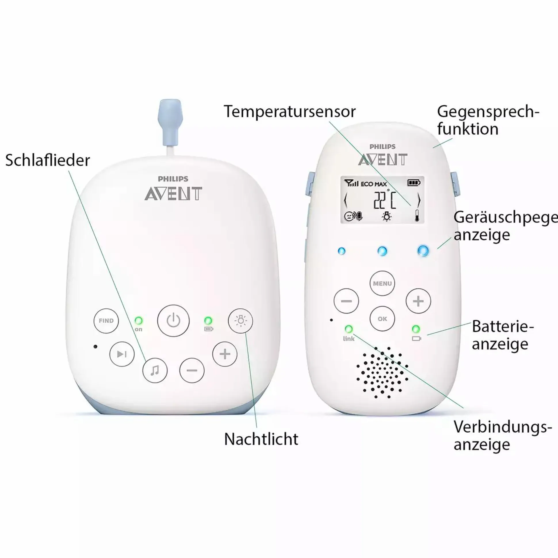 - Leuchten zeigen den Geräuschpegel im Zimmer des Babys an, auch wenn die Elterneinheit stummgeschaltet ist