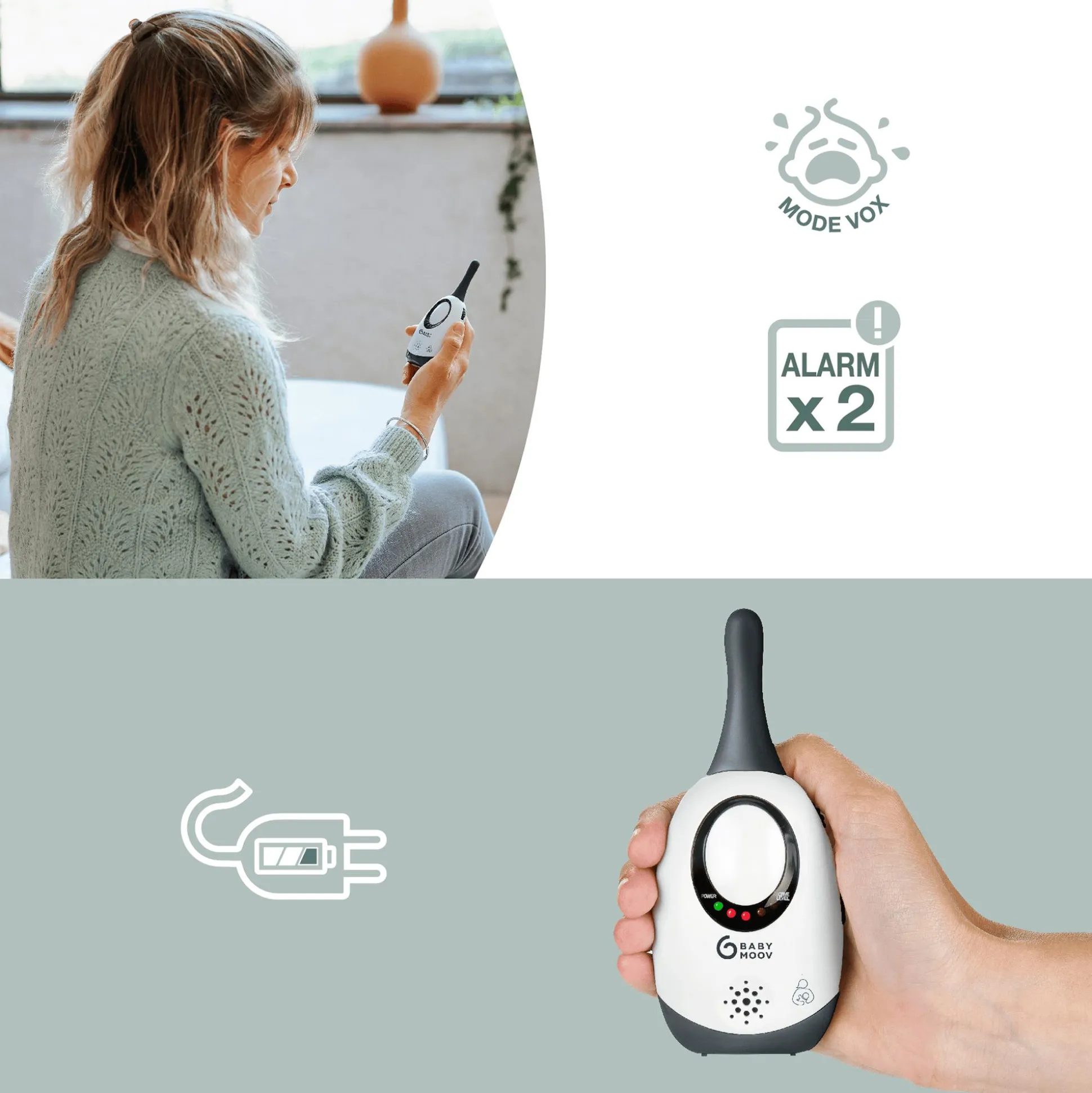 Der energiesparende Betrieb erfolgt durch VOX-Funktion mit Stimmaktivierung. Mit einer Reichweite von ca. 300m, 2 Empfangskanälen, 2 Alarmen (akustisch und Leuchtpegelanzeige) sowie einstellbarer Lautstärke und Anzeige des Batterieladestatus bietet das Babyphone alles, um mit einem guten Gefühl das Zimmer deines schlafenden Kindes zu verlassen.