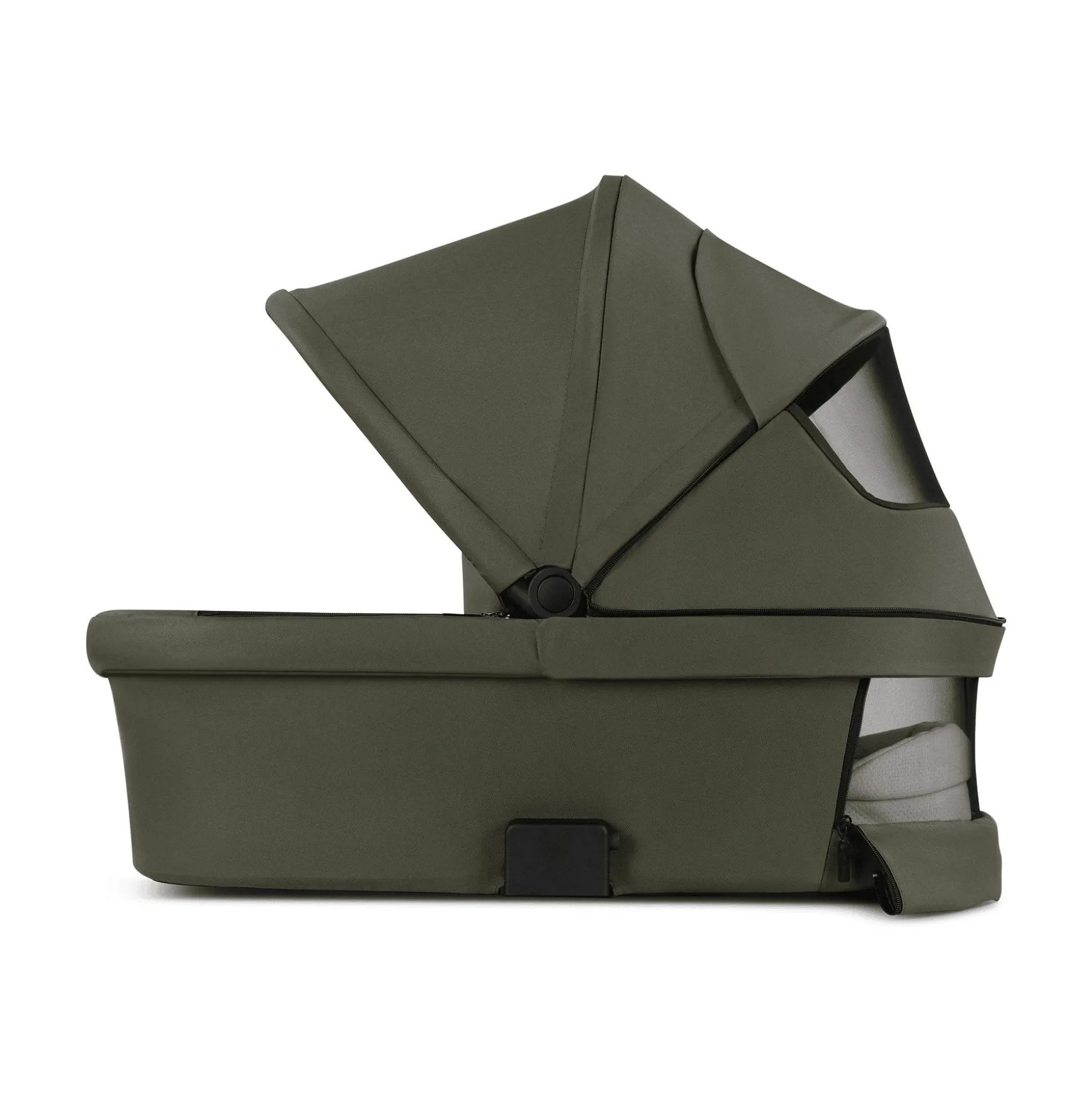 Weitere Belüftung wird durch zwei Belüftungsfenster ermöglicht, durch die du deinen kleinen Schatz auch immer im Blick hast. Dank des feinmaschigen Mesh-Materials ist dein Baby bei geöffneten Belüftungsfenstern selbst vor kleinsten Mücken und Insekten geschützt. Auch Sonne, Wind und Regen werden deinem Kind nichts ausmachen. Die abnehmbare Windschutzdecke, das große UPF 50+ Sonnenverdeck der Babywanne und die wasserabweisenden Stoffe bilden den perfekten Schutz bei Wind und Wetter. Je nach Sonneneinstrahlung kann das Verdeck mithilfe der Memory-Funktion ganz mühelos verstellt oder ganz aufgeklappt werden. Nach dem gleichen Memory-Prinzip entriegelst du auch die Babywannen-Halterung nacheinander und hast so immer eine Hand frei, um den Tragegriff festzuhalten. Die Babywanne nimmst du damit noch bequemer und sicherer vom Gestell deines Kinderwagens.