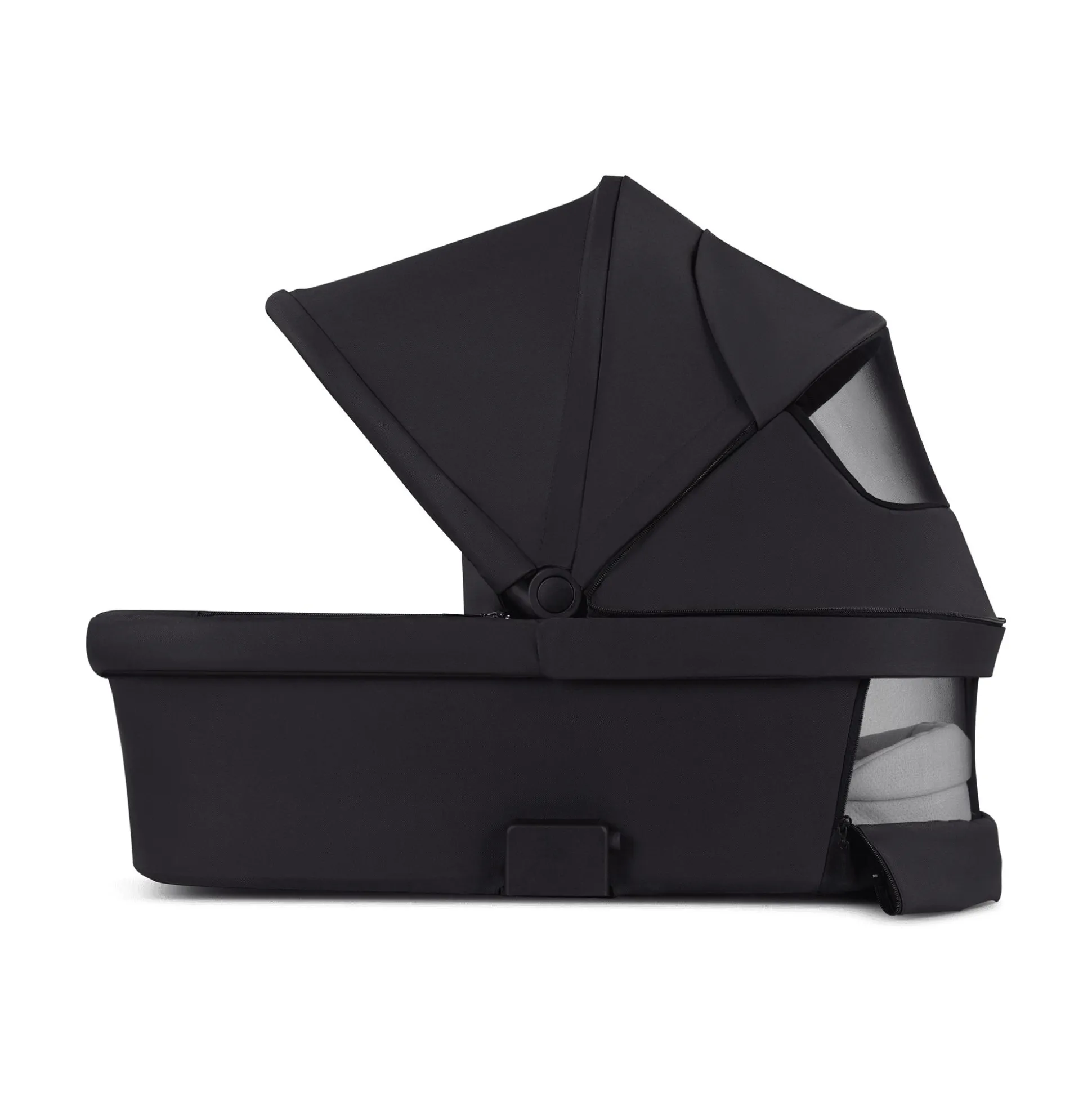 Weitere Belüftung wird durch zwei Belüftungsfenster ermöglicht, durch die du deinen kleinen Schatz auch immer im Blick hast. Dank des feinmaschigen Mesh-Materials ist dein Baby bei geöffneten Belüftungsfenstern selbst vor kleinsten Mücken und Insekten geschützt. Auch Sonne, Wind und Regen werden deinem Kind nichts ausmachen. Die abnehmbare Windschutzdecke, das große UPF 50+ Sonnenverdeck der Babywanne und die wasserabweisenden Stoffe bilden den perfekten Schutz bei Wind und Wetter. Je nach Sonneneinstrahlung kann das Verdeck mithilfe der Memory-Funktion ganz mühelos verstellt oder ganz aufgeklappt werden. Nach dem gleichen Memory-Prinzip entriegelst du auch die Babywannen-Halterung nacheinander und hast so immer eine Hand frei, um den Tragegriff festzuhalten. Die Babywanne nimmst du damit noch bequemer und sicherer vom Gestell deines Kinderwagens.