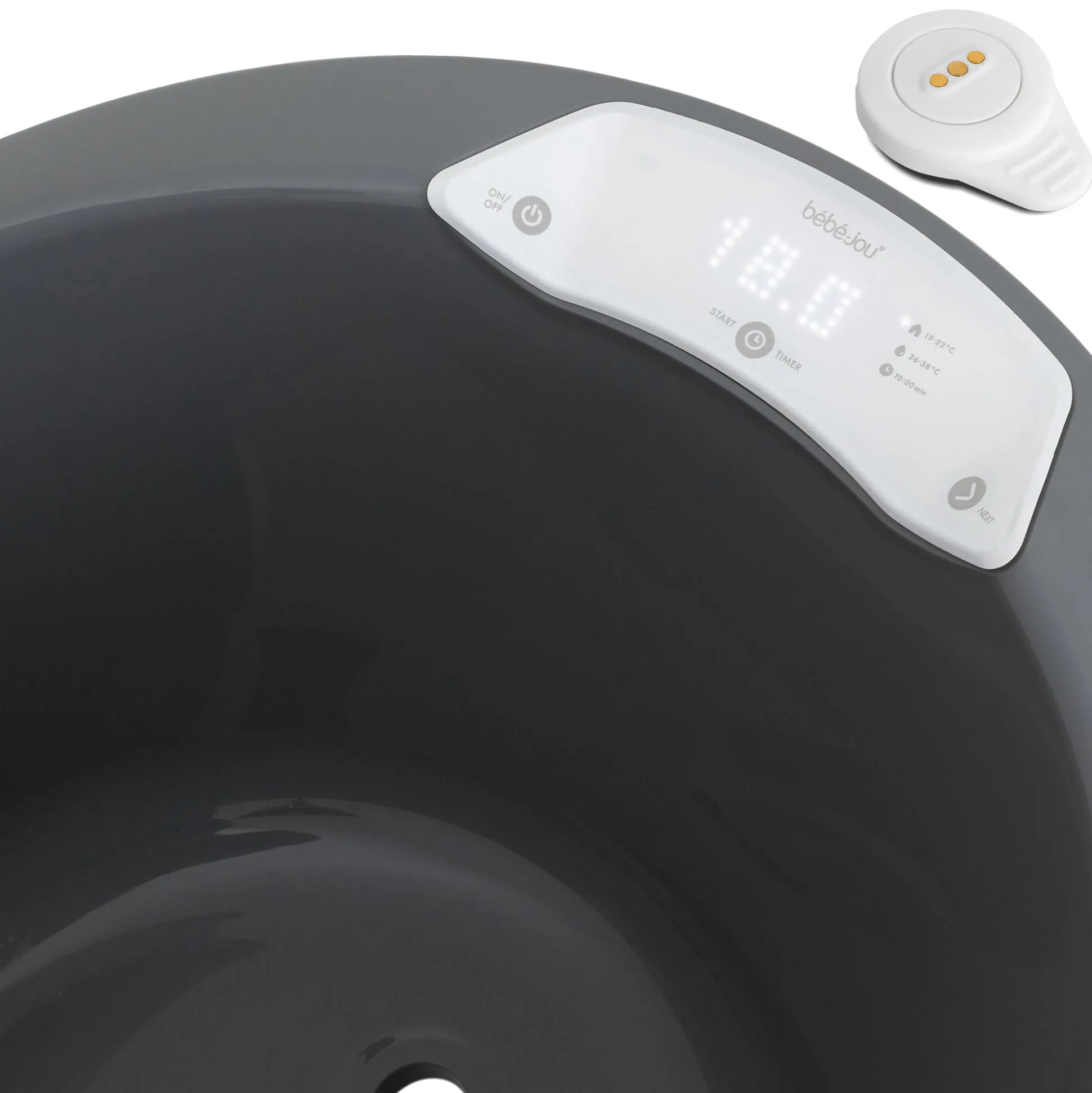 Die Temperaturen kannst du dank der drahtlosen Verbindung einfach auf dem Digitalmodul ablesen. Das schön gestaltete und handliche LED-Modul mit einer Touch-Oberfläche ist mit einem praktischen Timer ausgestattet, den du individuell auf bis zu 10 Minuten Badezeit einstellen kannst. So ist dein Baby niemals zu lange im Wasser und dadurch wird zusätzlich das Austrocknen der empfindlichen Babyhaut vermieden. Für einen höheren Komfort kannst du die Wanne mit dem separat erhältlichen Badewannenständer Sense kombinieren.