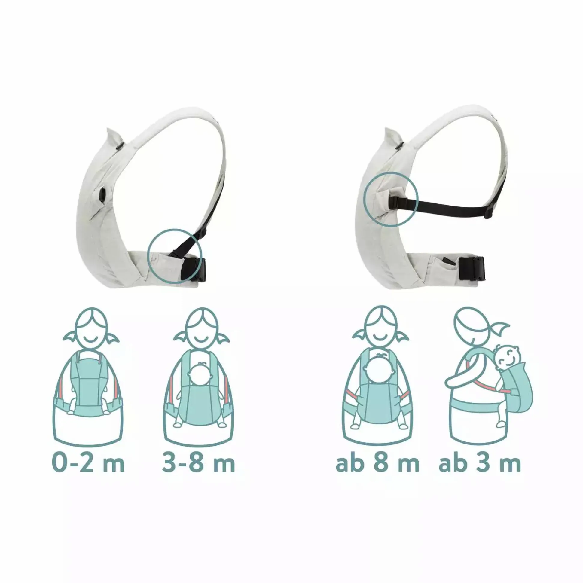 Durch die verschiedenen Tragemöglichkeiten und die vielen Verstellmöglichkeiten der Gurte lässt sich für jeden Träger und Tragling die passende Einstellung finden. Du kannst die Träger sowohl überkreuzt als auch gerade wie bei einem Rucksack verwenden. Wenn dein kleiner Sonnenschein alt genug ist, kannst du die Trage auch als Rückentrage verwenden. Durch die leicht zugänglichen Steckschnallen am Hüftgurt und auf den Flaps lässt sich die Trage auch super allein ohne Hilfe anlegen.