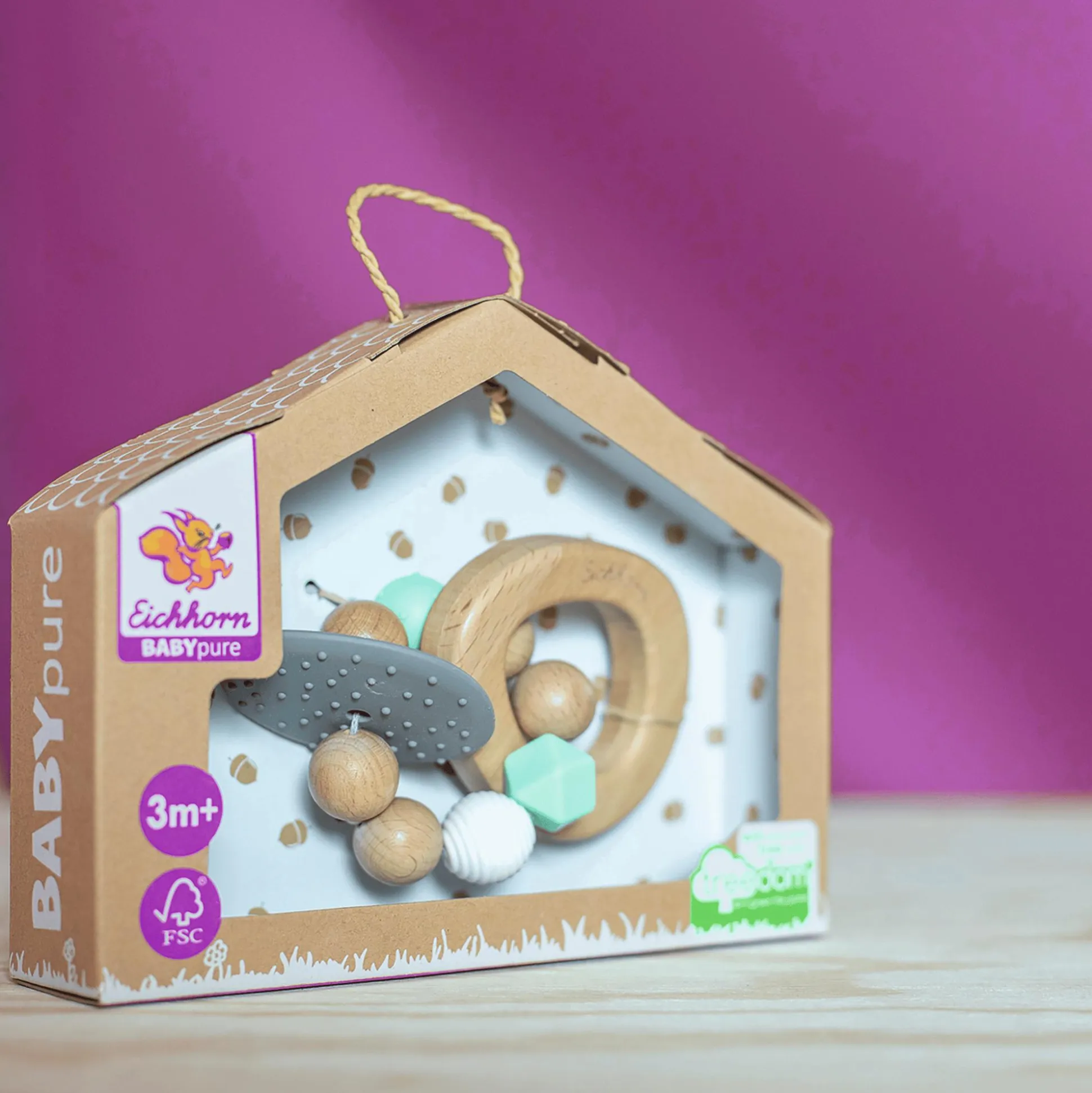 Dieser Beißring von Eichhorn aus hochwertigem Buchenholz schenkt deinem kleinen Schatz vielfältige Eindrücke und Reize. Die sanften Fühlperlen und die angenehme Beißfläche bieten ein wahres Sinneserlebnis für die kleinen Händchen.Was diesen Beißring außerdem besonders wundervoll macht, ist die Verwendung von FSC-zertifiziertem Holz aus nachhaltiger Forstwirtschaft bei seiner Herstellung. So kannst du die Welt gemeinsam mit deinem Kind erkunden und gleichzeitig einen Beitrag zum Schutz unserer Umwelt leisten. Für Babys ab drei Monaten ist der Eichhorn Baby Pure Beißring genau das Richtige, um die ersten Zähnchen zu begleiten.