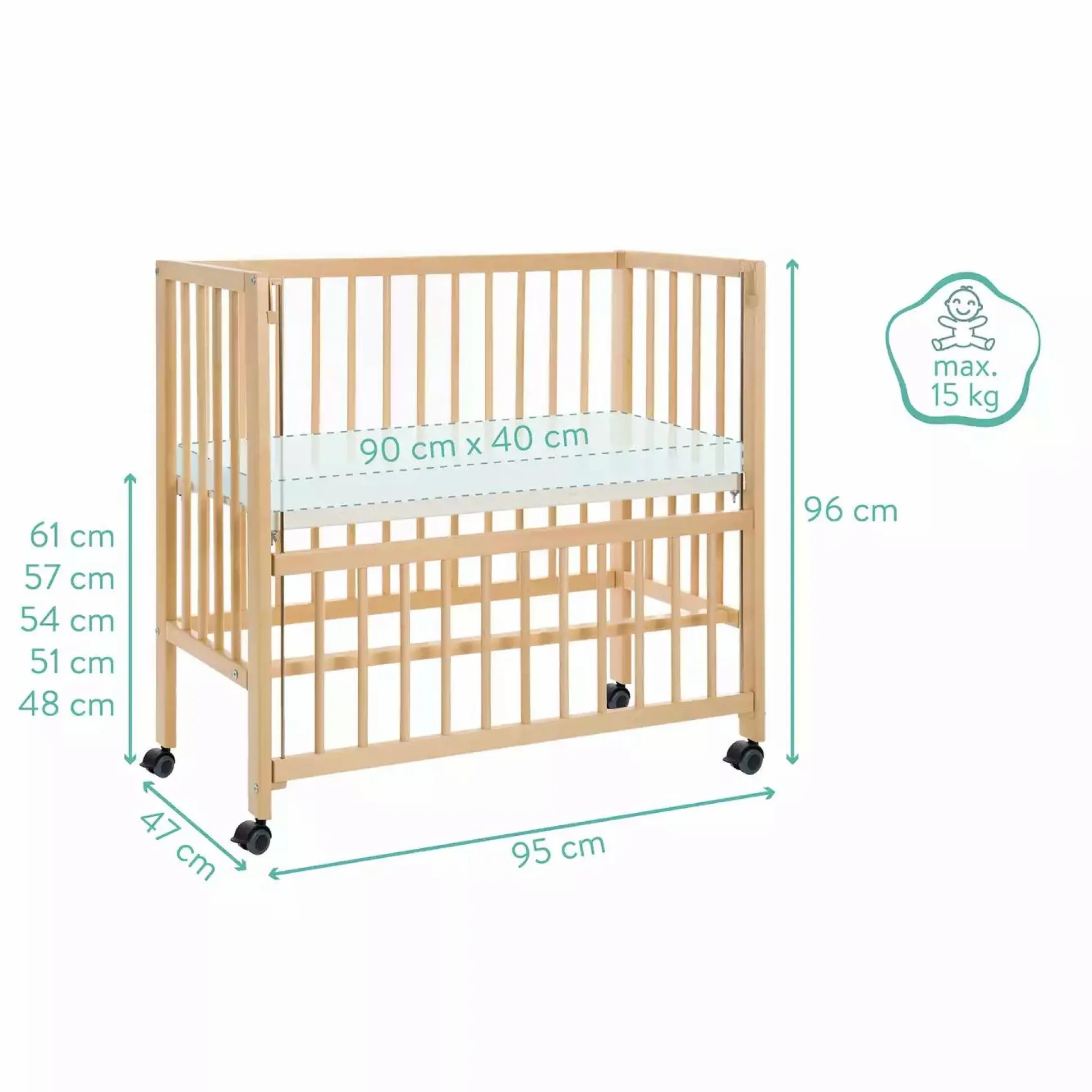 - 5 einstellbare Höhen – 48 cm, 51 cm, 54 cm, 57 cm und 61 cm (gemessen vom Boden bis Oberkante Matratzenplatte – ohne optionaler Matratze)