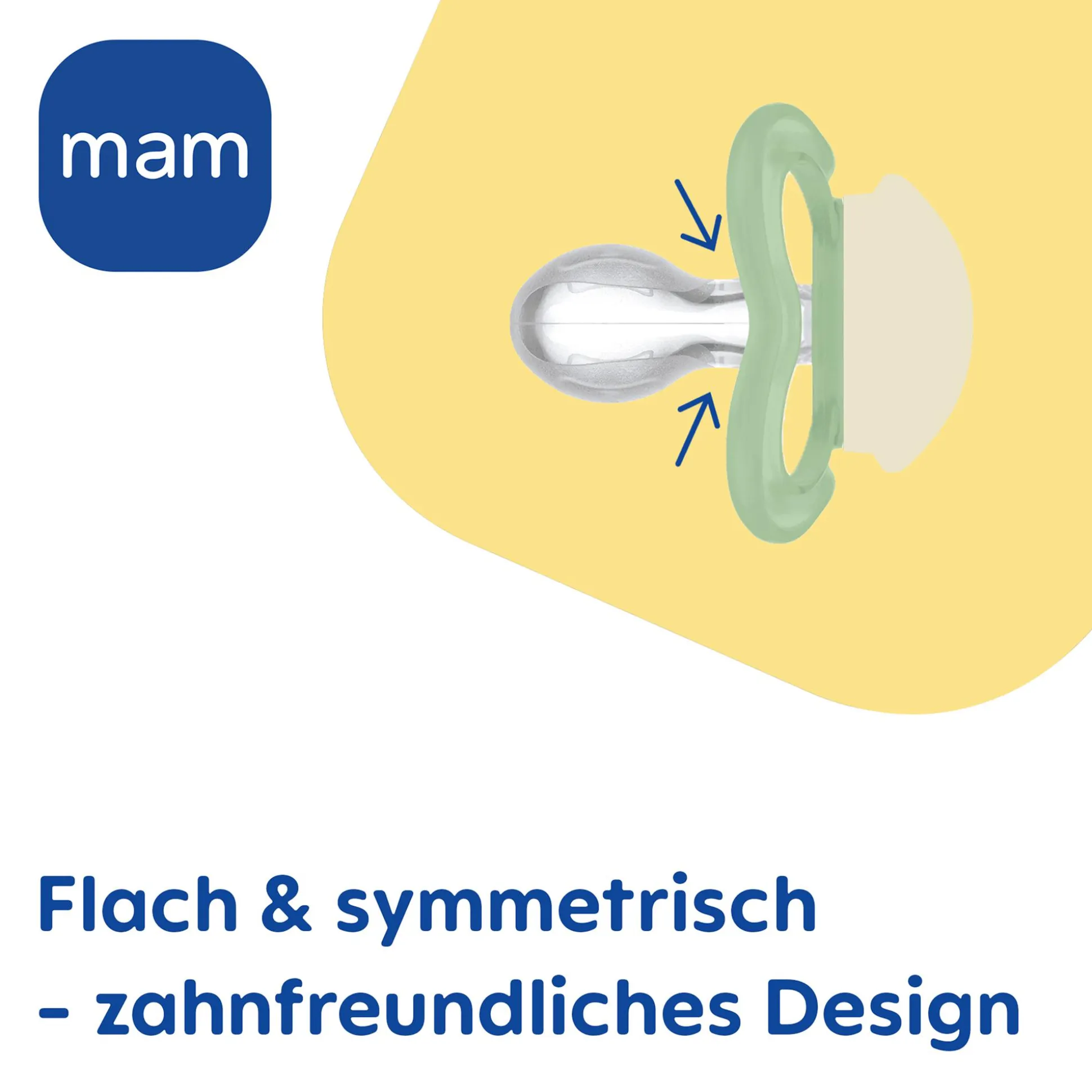 Die MAM Schnuller werden mit Zahnmediziner*innen entwickelt und sind dank ihres symmetrischen, flachen Saugteils besonders zahn- und kieferfreundlich. und hilft so, Zahnfehlstellungen vorzubeugen. Außerdem besteht das Saugteil aus speziellem SkinSoft-Silikon, welches sich vertraut anfühlt.Sowohl Saugteil als auch Schnullerschild haben eine symmetrische Form, weshalb der Schnuller immer richtig herum im Mund liegt. Ein Schnullerband lässt sich am Greifknopf einfach befestigen. Da der Schnullerknopf im Dunkeln leuchtet, können ihn Eltern und Babys nachts leicht wiederfinden – für weniger Stress und ruhigere Nächte.