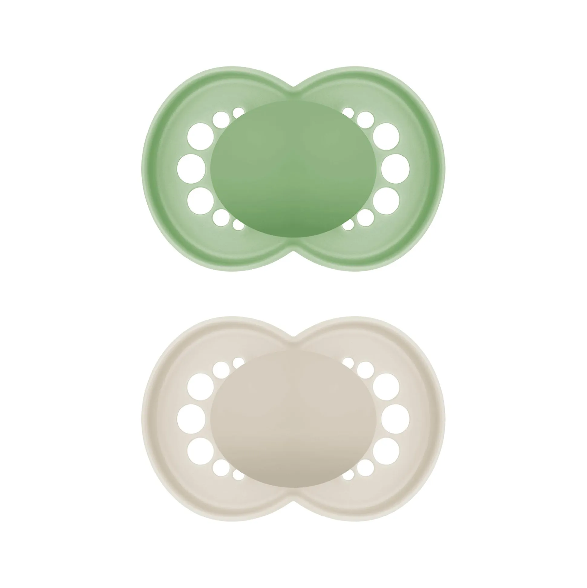 Dieses 2er-Set Beruhigungssauger Original Silikon ab 16 Monate von MAM besteht aus einem grünen Schnuller und einem beigen Schnuller.