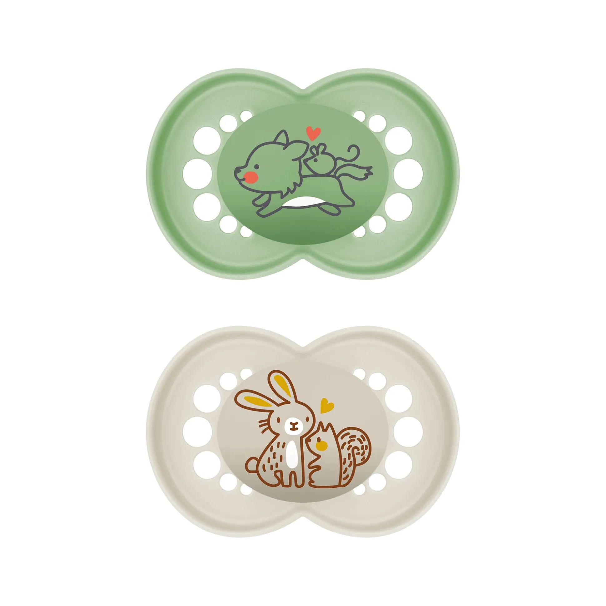 Dieses 2er-Set Beruhigungssauger Original Silikon 6-16 Monate von MAM besteht aus einem grünen Schnuller mit einem niedlichen Hunde-Maus-Motiv und einem beigen Schnuller mit einem Hasen-Eichhörnchen-Motiv.