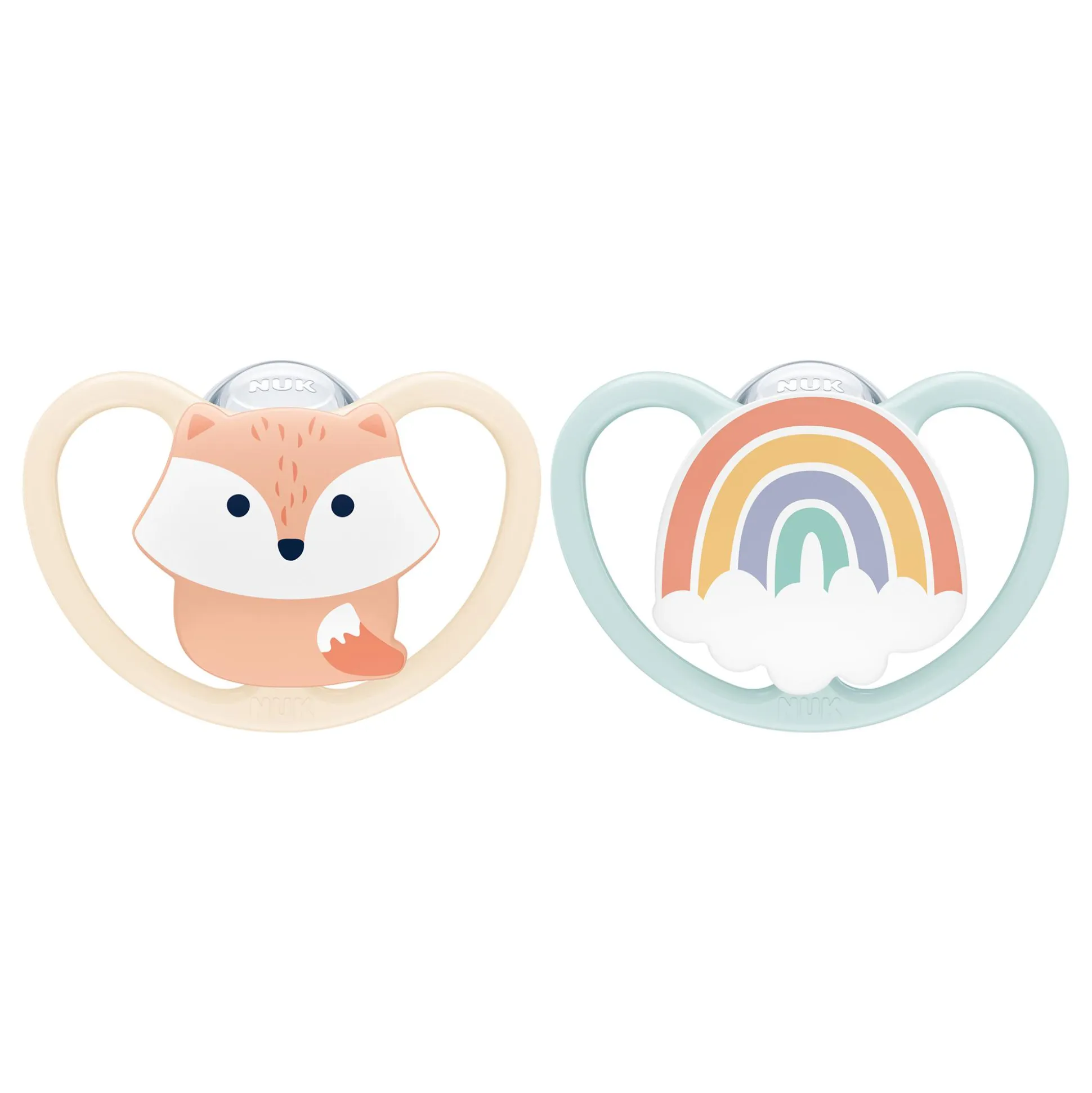 Diese Beruhigungssauger Space von NUK kommen in einem praktischen 2er-Pack und einer wiederverwendbaren Schnullerbox zu dir nach Hause! Der eine Schnuller hat ein niedliches Fuchs-Motiv und der andere ein tolles Regenbogen-Motiv.