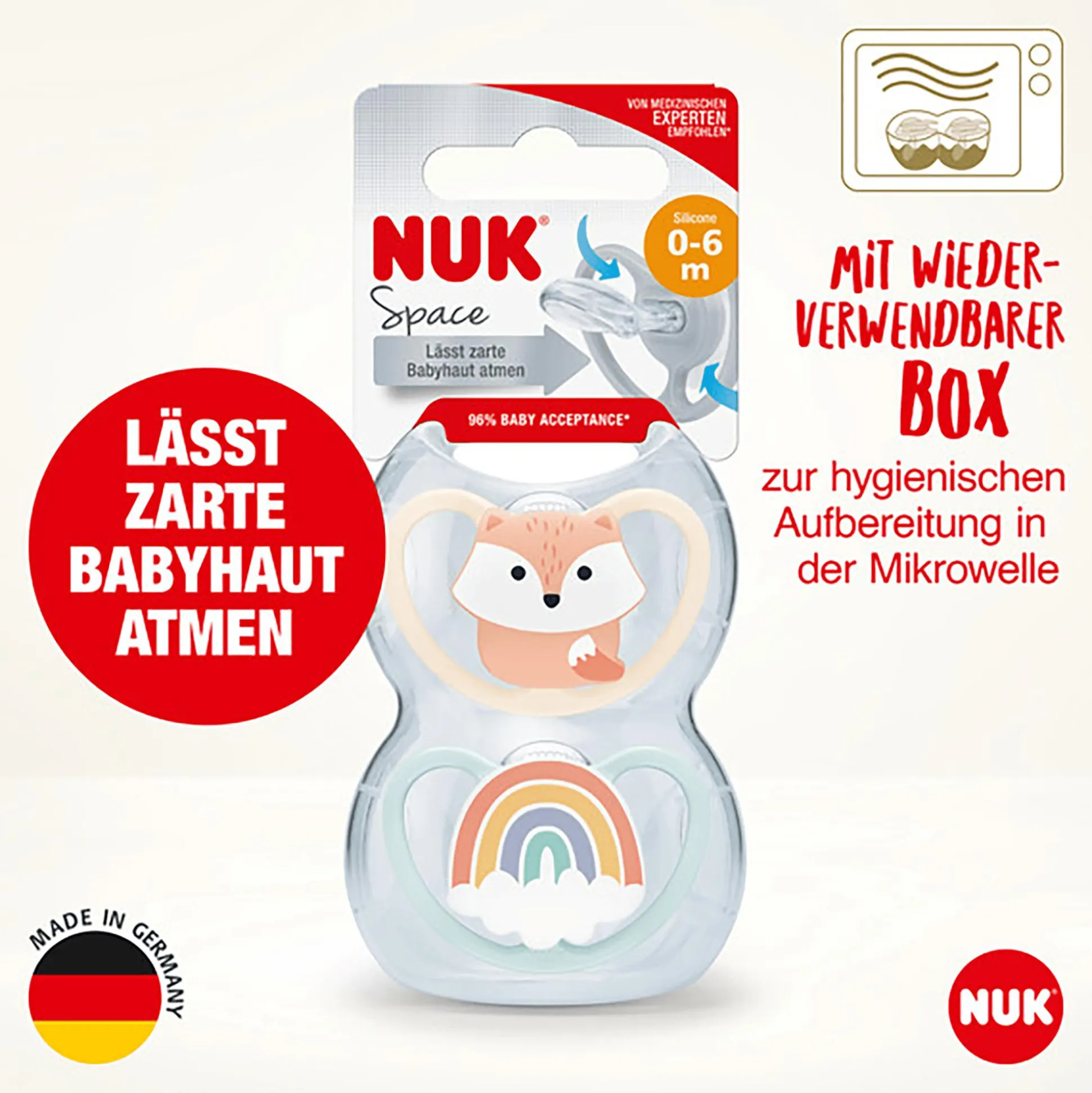 Die Haut deines Babys ist zart und empfindlich. Auch wenn dein Baby seinen Schnuller liebt, kann der Speichel beim Nuckeln die Haut strapazieren. Deshalb wurden die NUK Space Schnuller so gestaltet, dass er der Haut genügend Luft und Raum zum Atmen gelassen wird. Dank seines einzigartigen Designs mit extragroßen Öffnungen und schmalen Rahmen, die kaum Kontakt zur Haut deines Babys haben, ist der Space nicht nur sanft zur Haut, er sieht auch toll aus.